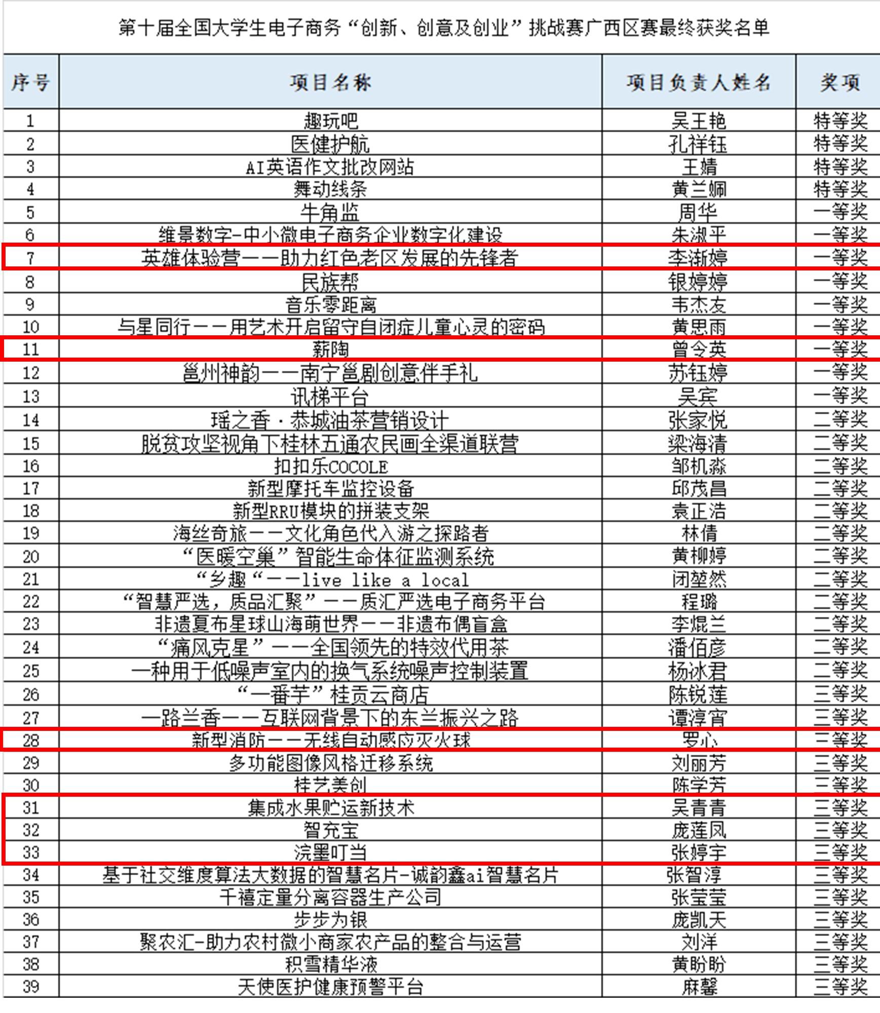7月18日,第十届全国大学生电子商务“创新、创意及创业”挑战赛广西赛区选拔赛在桂林电子科技大学闭幕。我校获得一等奖2项、三等奖4项,最佳创业项目单项奖1项,还获得最佳组织奖(广西共三个高校获得),取得该赛事的新突破。