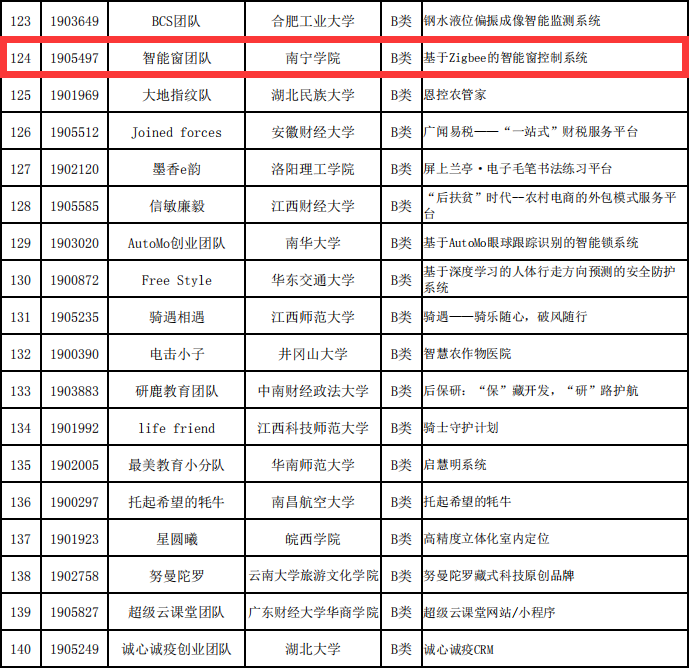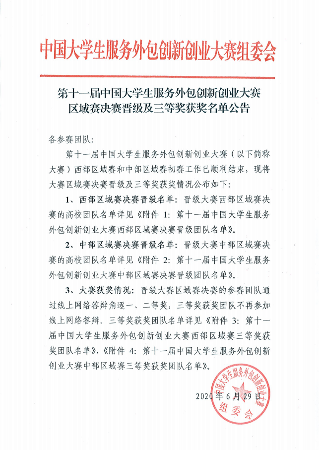 近日,第十一届中国大学生服务外包创新创业大赛(以下简称服创大赛)西部区域赛和中部区域赛网评工作已顺利结束,在我校师生的共同努力下,取得两支队伍晋级大赛区域赛决赛、《基于 Zigbee 的智能窗控制系统》项目荣获中部区域赛三等奖,以下是晋级决赛名单以及获奖名单。