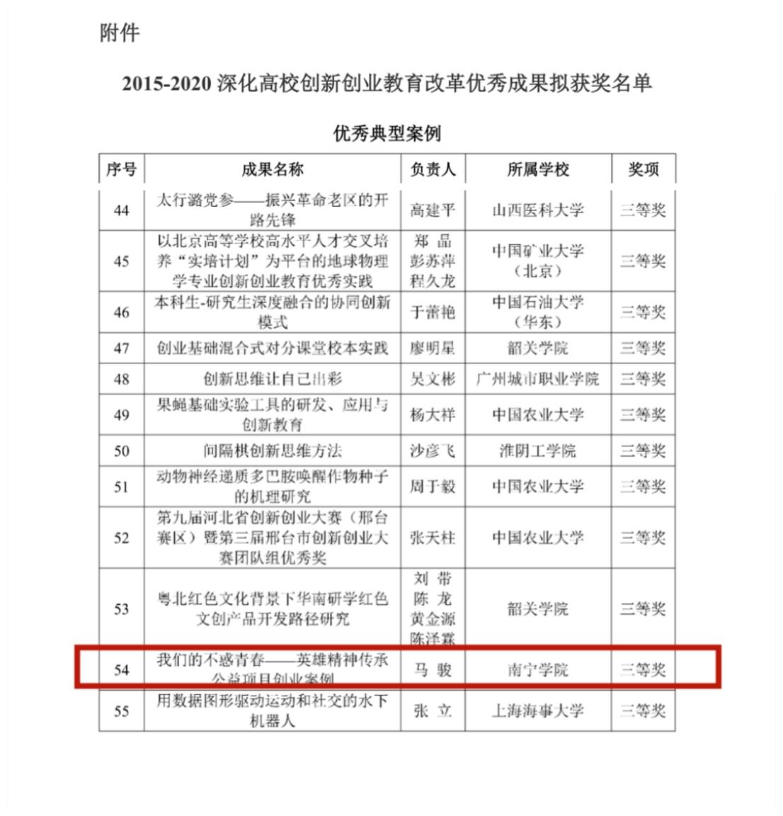 8月10日,由中国高校创新创业教育联盟和中国高校创新创业教育研究中心联合发起的2015-2020深化高校创新创业教育改革优秀成果征集活动公布评审结果,kaiyun体育网页登录入口《我们的不惑青春——英雄精神传承公益项目创业案例》荣获优秀实践类三等奖。该成果由kaiyun体育网页登录入口副校长陈雄章教授,创新创业教育学院院长马骏博士、副院长黄如博士,韦林杉博士,邓海贝,李梓昕,罗维长,李梦茹等老师共同完成。