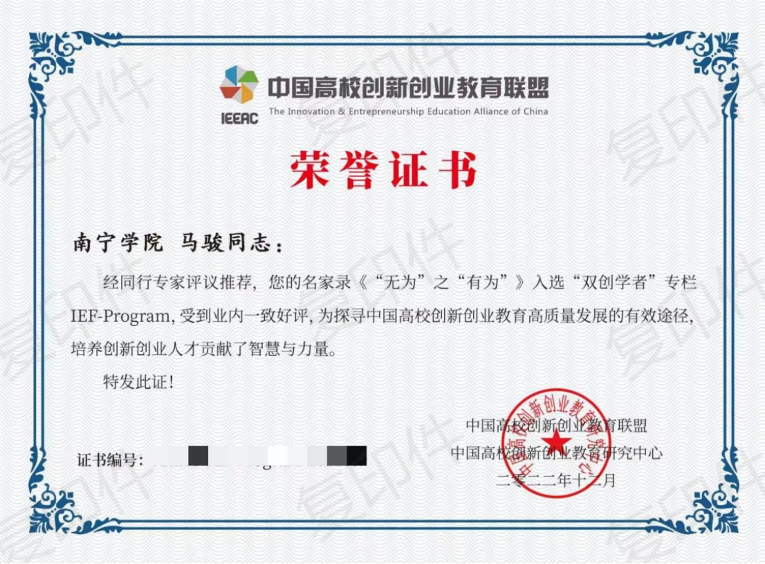 经同行专家评议推荐,马骏博士的名家录《“无为”之“有为”》入选“双创学者”专栏IEF-Program,受到业内一致好评,评议专家认为马骏博士为探寻中国高校创新创业教育高质量发展的有效途径培养创新创业人才贡献了智慧与力量,特颁授证书。