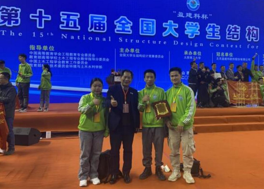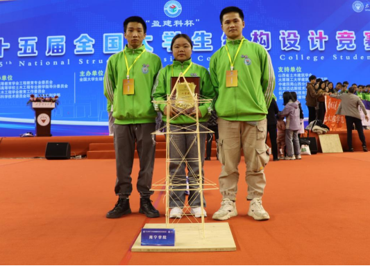 3月22日至3月26日,由全国大学生结构设计竞赛委员会主办、太原理工大学承办的“盈建科杯”第十五届全国大学生结构设计竞赛在太原理工大学成功举办。该赛事是列入2022全国普通高校大学生学科竞赛榜单里的一类赛事,包括来自清华大学、上海交通大学、浙江大学等双一流高校的110所高校的111支参赛队伍进入国赛,我校土木与建筑工程学院选派的2019级土木工程专业学生马明仕(队长)、盆斯琪、韦新林代表学校参加本次比赛。学生们经过为期3天的激烈比赛,16个小时的模型制作,克服现场工具不足、规则临时变化等不利条件,最终获得国赛二等奖。