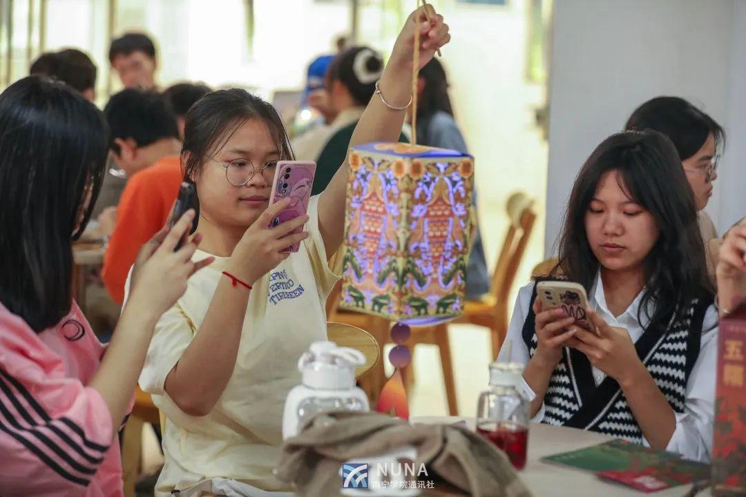 紧接着,陈老师通过图片与现场实物制作的形式展示了其多年来打造的广西“好物”,包括刘三姐皮影戏DIY伴手礼盒、五色锦鲤糯米饭礼盒、一茶一锦六堡茶礼盒、炮龙戏珠礼盒、绣里乾坤春节礼盒等。在场的同学们纷纷称赞陈老师对广西非遗产品的创新设计,并以小组的形式动手制作五色锦鲤糯米饭礼盒和锦鲤灯笼。