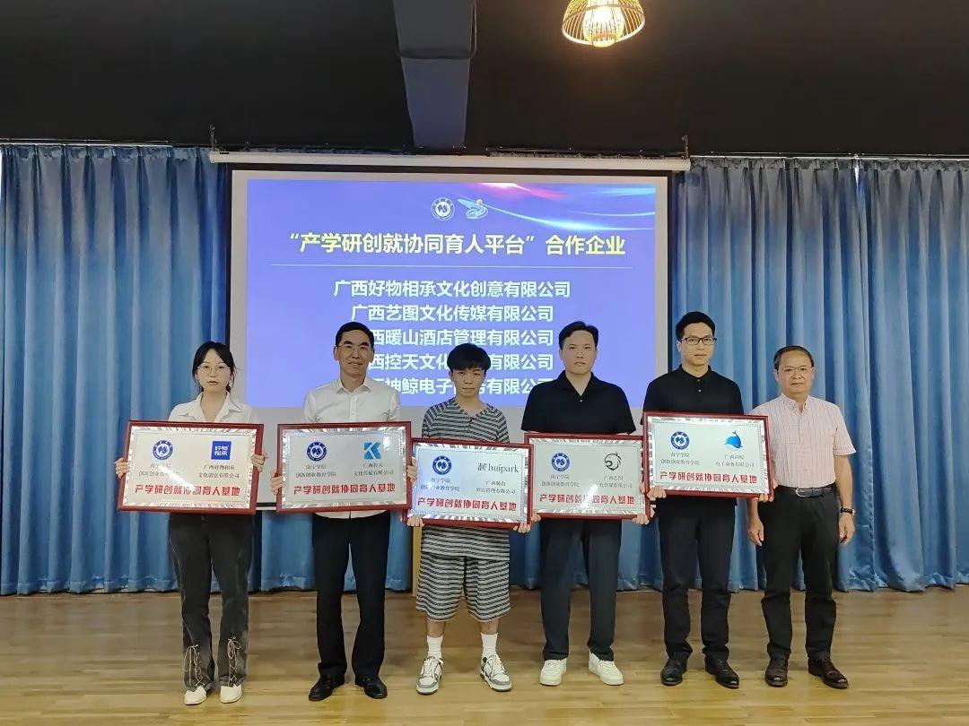 随后,举行“产学研创就协同育人平台”合作企业的授牌仪式。陈雄章副校长为广西好物相承文化创意有限公司、广西艺图文化传媒有限公司、广西暖山酒店管理有限公司、广西控天文化传媒有限公司、广西神鲸电子商务有限公司等5家合作企业颁发“产学研创就协同育人基地”牌匾;创新创业教育学院院长马骏博士为合作企业所提供的实战任务的创新创业实践团队颁发创业园入园钥匙。