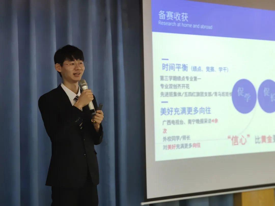紧接着,由第八届“互联网+”大赛国赛银奖《智储科技》项目负责人马啸飞同学作经验分享。马啸飞同学分别从参赛经历及备赛收获两方面进行分享。他提出,在备赛中应学会平衡时间,时刻让自己成为“七十二变的孙悟空”,并对个人的未来充满更多美好向往,充分发挥“互联网+”大赛“促学、促长”的作用,秉承“‘信心’比黄金更有价值”的信念,让我们能够在“互联网+”大赛的赛场上梦想成真。