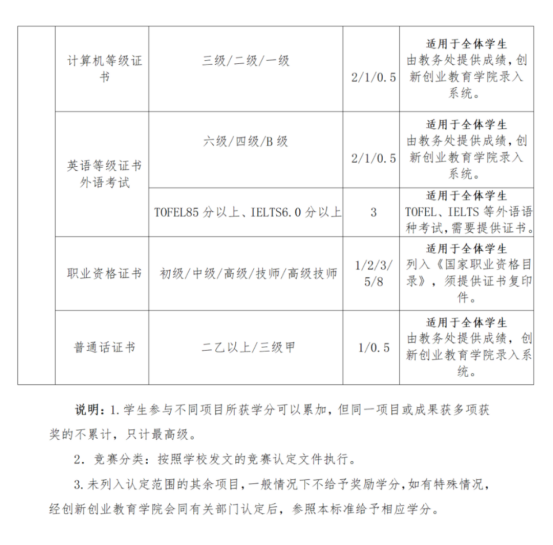 计算机等级、英语等级、普通话测试、 SIYB、开放实验室项目、大学生创新创业训练计划项目等,由创新创业教育学院统一收集并导入教务系统进行认定。