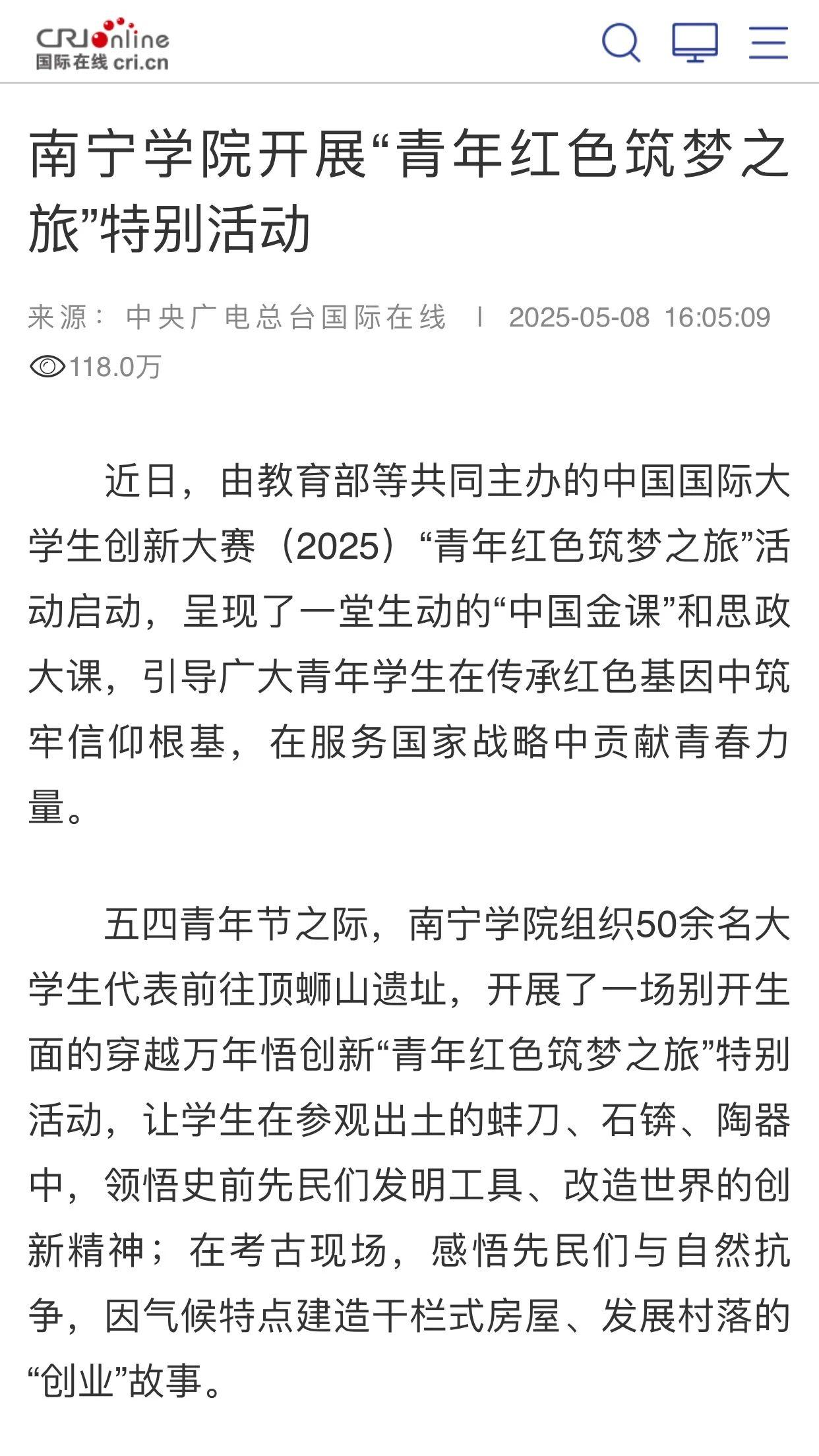 在五四青年节来临之际,kaiyun体育网页登录入口组织大学生前往顶蛳山史前遗址开展别开生面的“青年红色筑梦之旅”活动。该活动获得了包括中央广电总台国际在线、广西日报等多家主流媒体的报道,截止到2025年5月15日10:00,中央广电总台国际在线客户端的阅读量已突破118万。