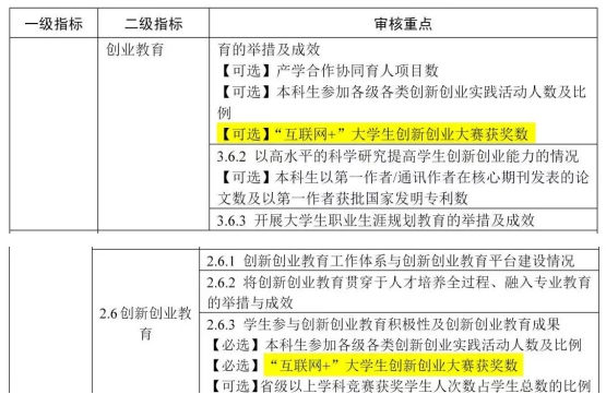 2021年1月21日,教育部制定的《普通高等学校本科教育教学审核评估实施方案(2021—2025年)》公布,其中创新创业教育作为教育教学水平的二级指标纳入评价体系,“互联网+”创新创业大赛获奖数作为可选审核重点,还作为第二类审核评估中创新创业教育审核重点的必选项。