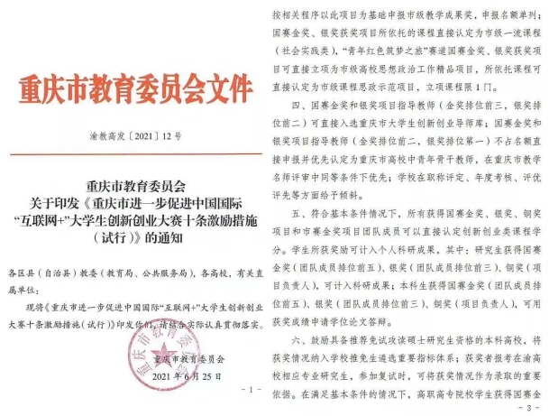 重庆市教育厅:国赛金奖、银奖获奖项目所依托的课程直接认定为市级一流课程(社会实践类);“青年红色筑梦之旅”获金奖、银奖项目所依托课程可直接认定为市级课程思政示范项目。