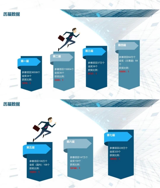 七届大赛累计603万个团队的2533万名大学生参赛,在第七届大赛中,产生228万余个项目。