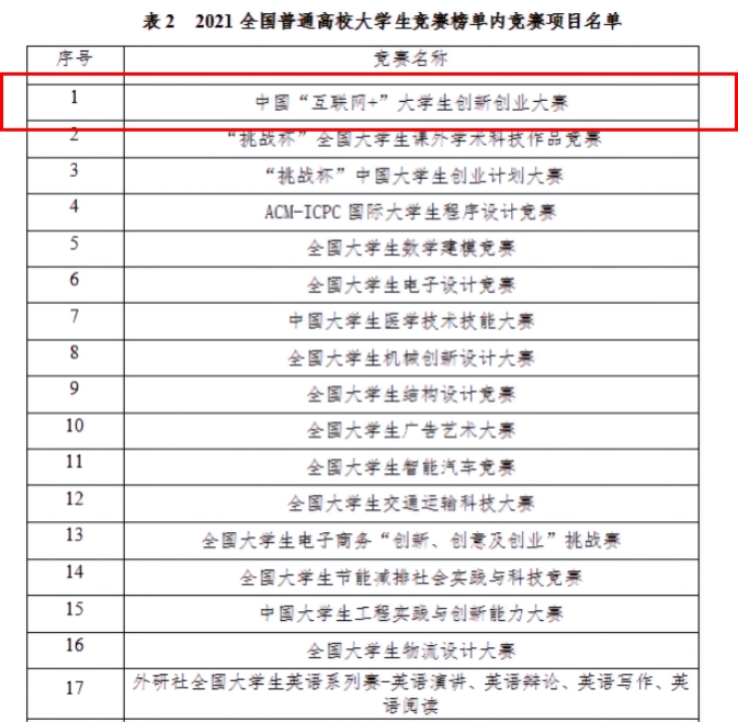 中国国际“互联网+”大学生创新创业大赛位于每年教育部发布的全国普通高校大学生竞赛排行榜首位。