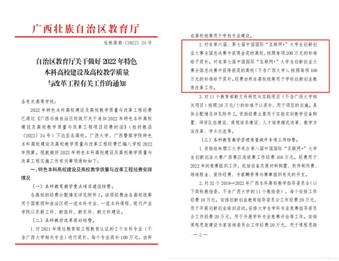 广西壮族自治区教育厅对在中国国际“互联网+”大学生创新创业大赛中获得全国金奖的高校,按照每项200 万元的标准进行奖补;对获得银奖的高校,按照每项100 万元的标准进行奖补。