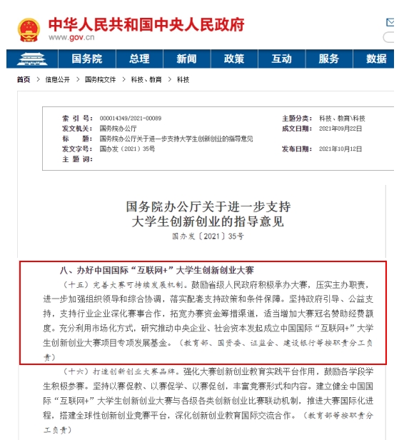 《国务院办公厅关于进一步支持大学生创新创业的指导意见》(国办发〔2021〕35号)中提到“办好中国国际‘互联网+’大学生创新创业大赛”。