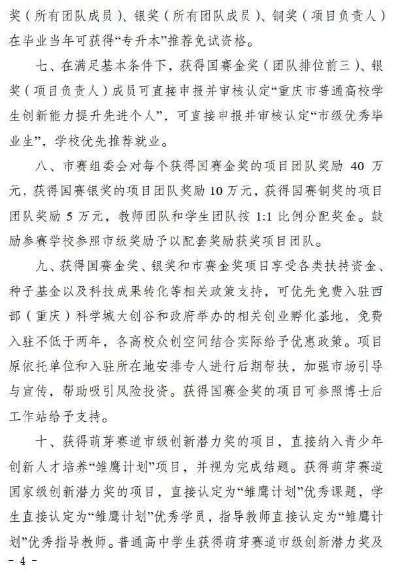 关于印发《重庆市进一步促进中国国际“互联网+”大学生创新创业大赛十条激励措施(试行)》的通知