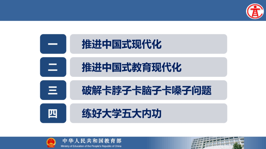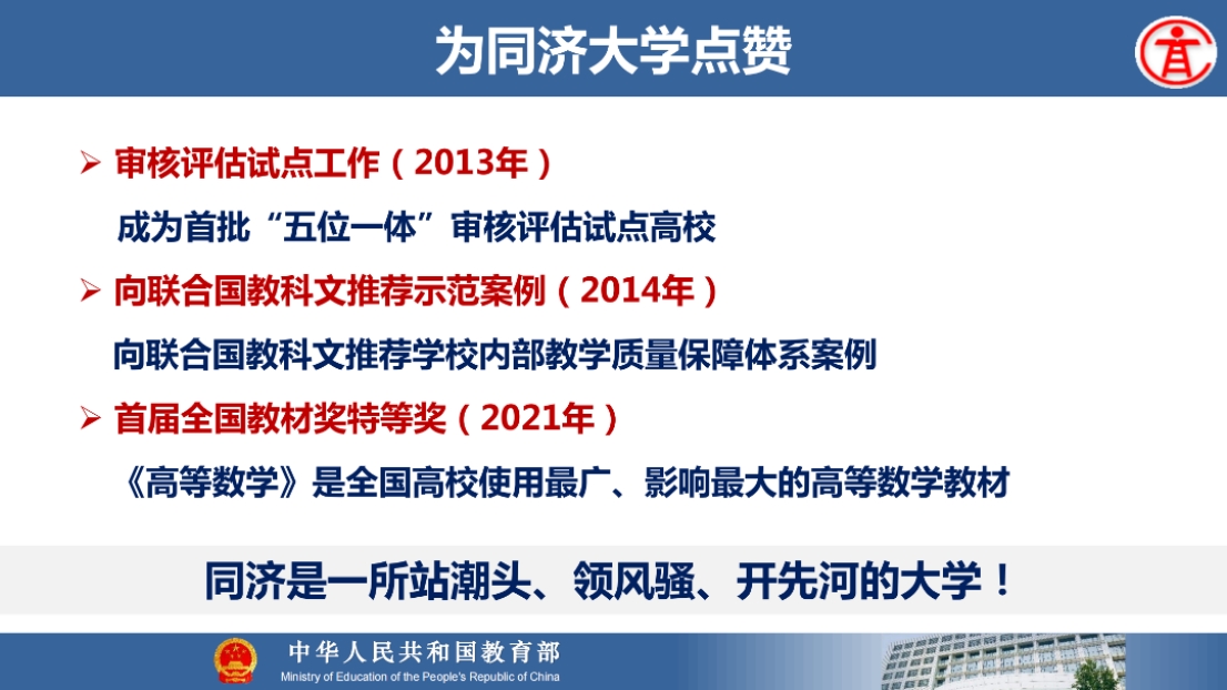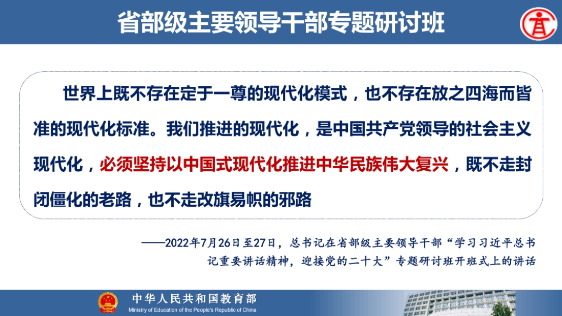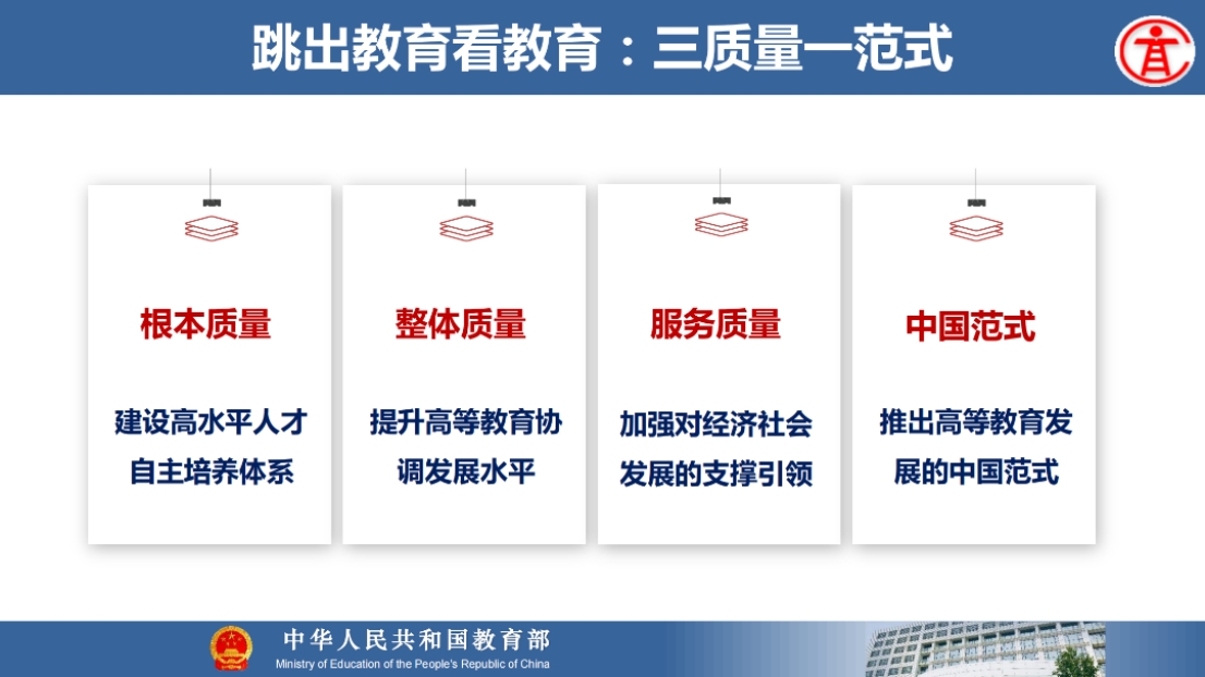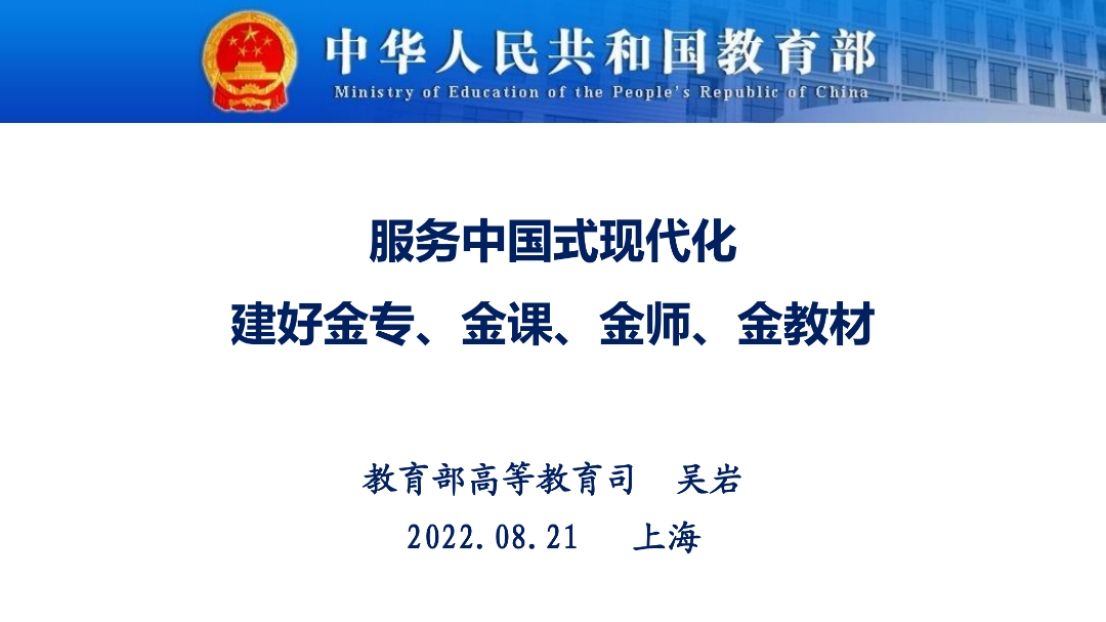 8月21日上午,教育部高等教育司吴岩司长出席同济大学中层干部综合治理能力提升专题研讨班,并作题为“服务中国式现代化建好金专、金课、金师、金教材”的主旨报告。