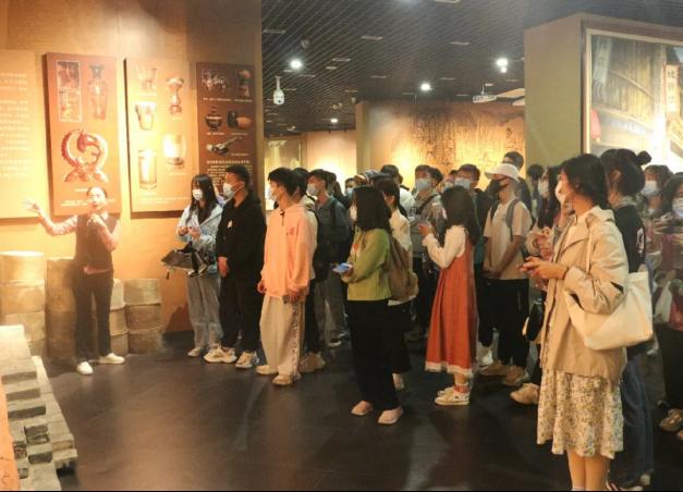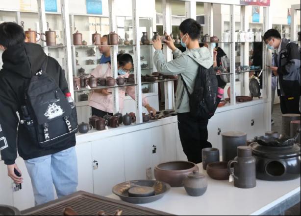 第一站来到了坭兴陶陶博物馆。坭兴陶作为中国四大名陶之一,具有悠久的历史和文化底蕴。同学们跟随着讲解人员的步伐,了解了被评为国际非物质文化遗产的坭兴陶烧制技艺,参观了坭兴陶的代表性作品。随后在坭兴陶小镇中,师生们参观了大师工作室,欣赏坭兴陶作品,与大师们交流坭兴陶制作工艺及市场行情,收获满满。
