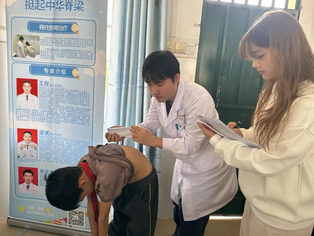 在随后的筛查环节,来自广西壮族自治区人民医院推拿科的李医生和谢医生借助专业筛查工具,为小学生进行脊柱侧弯筛查。检出了多例疑似阳性病例。谢医生介绍说:“在农村地区,脊柱侧弯问题往往被忽视,提前发现脊柱侧弯疑似病例,提醒家长及时跟进,避免造成病情恶化”。韦某某同学之前一直被腰痛困扰,本次筛查初筛侧弯超过5度,疑似阳性病例,需要转介专业机构进一步检查。她感言道:“我经常长时间躺在沙发上看书或者玩手机,也没有意识到会对脊柱健康造成危害。感谢筛查团的医生哥哥,让我提前发现了问题”。华联小学梁世兆校长、那了小学黄生和校长、新江镇中心学校陆子岳书记、邕宁区教育局林盛锋副局长对公益行动高度肯定,鼓励公益团队再接再厉,配合政府和学校更好地为孩子们的脊柱健康保驾护航。