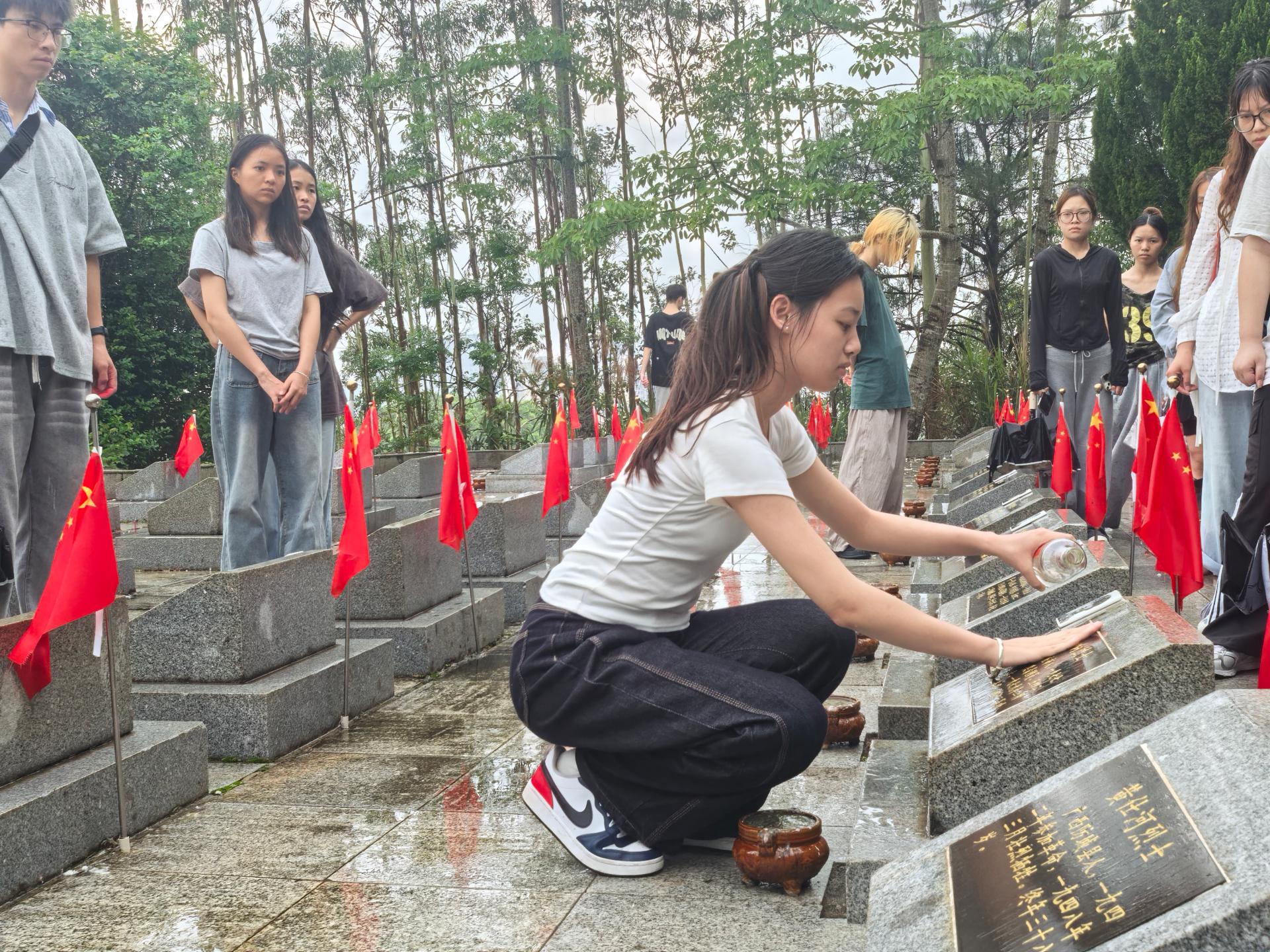 在大清国一号界碑前,黄秀彩同学感慨:“斑驳的碑文宛如历史的注脚,清晰地映照出祖国疆域的变迁,时刻警醒着新时代青年肩负守卫祖国思想与领土边疆的双重使命。从泛黄的侨批到锈迹斑斑的大炮,从侨批馆内珍藏的“银信”到白龙炮台锈迹斑斑的大炮,再到城北烈士陵园戍边英烈墓,这些元素共同构筑起一座生动立体的国防教育矩阵。”在防城城北烈士陵园,王雅博同学深受触动:“先烈们用生命捍卫了祖国的边疆,他们的事迹让我深刻认识到如今的和平来之不易。作为新时代的青年,我们应当铭记历史,传承这份爱国精神,为实现中华民族伟大复兴的中国梦贡献自己的力量。”马嘉龙同学表示:“从课程的精妙设计到深入浅出地讲解,无不彰显陈教授的专业与用心。也让我走在东兴的街头,一边感受着这座边境小城如今的繁华与安宁,一边想着正是无数革命先辈的付出,才换来我们现在的幸福生活。这让我更加珍惜当下,也明白自己肩上的责任。我们年轻人要把红色精神记在心里,在生活和工作中不怕吃苦、勇于担当,把这份精神传承下去,为家乡、为国家贡献自己的一份力量。”莫晓宁同学说道:“在东兴口岸,中越友谊大桥等见证了跨国情谊,界碑更让我深知国土意义。大清国一号界碑、京族博物馆,让我触摸到历史脉络与独特民族文化。白龙炮台等国防遗迹,唤起爱国情怀。漫步金滩,感受自然馈赠。此次行程,是知识的扩充,更是心灵的洗礼,激励我在未来不断探索求知,传承文化与精神。”
