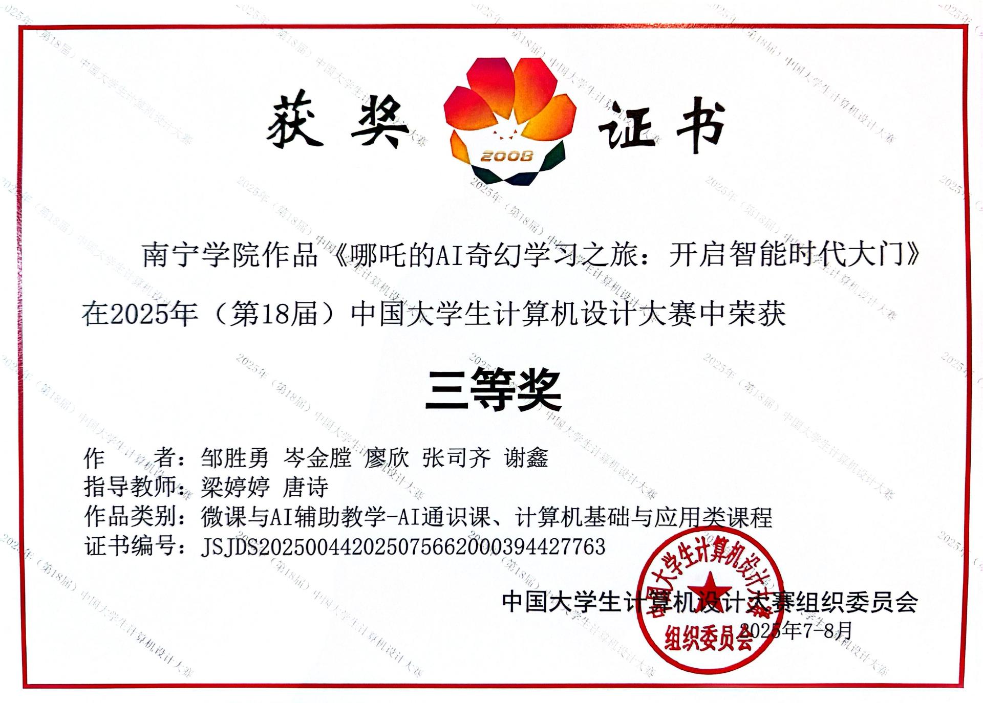 7月25日,在2025年(第18届)中国大学生计算机设计大赛全国总决赛中,人工智能学院选送的两支学生团队表现优异,其参赛的微课作品在“微课与AI辅助教学”类别中双双斩获国家级三等奖,创下我校在该赛事类别中的历史最佳成绩。