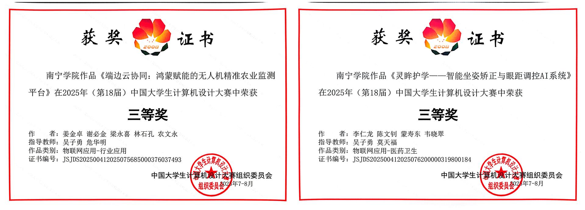 在刚刚圆满落幕的2025年(第18届)中国大学生计算机设计大赛杭州国赛决赛区中,信息工程学院师生团队凭借卓越的创新实力再创佳绩。信息工程学院两项学生原创作品——《端边云协同:鸿蒙赋能的无人机精准农业监测平台》与《灵眸护学--智能坐姿矫正与眼距调控AI系统》,经过激烈角逐与严格评审,双双荣膺全国三等奖,充分彰显了信息工程学院在应用型人才培养和信息技术创新领域的显著成果。