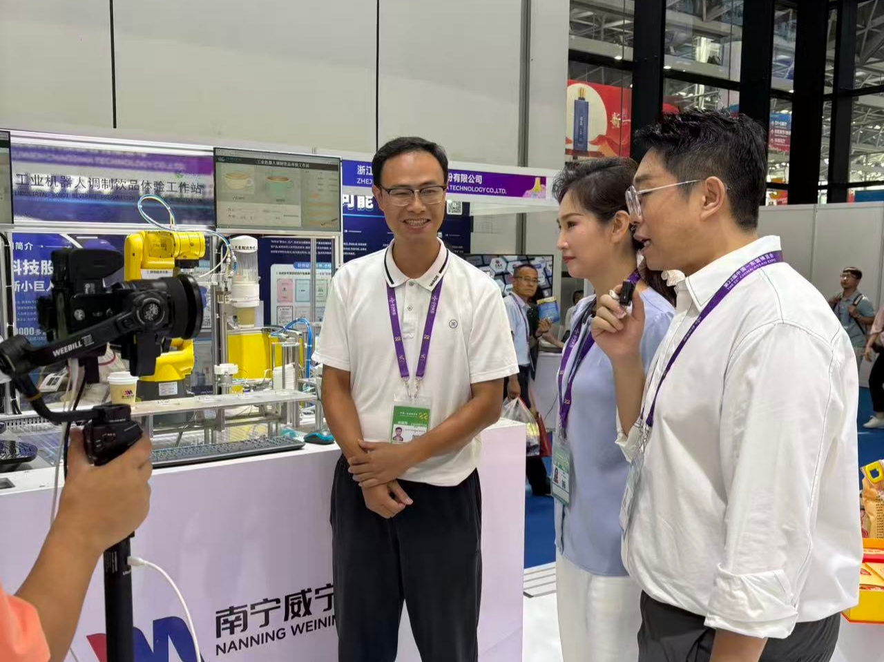 kaiyun体育网页登录入口携手华为技术有限公司,为南宁威宁集团东博会展位提供“kaiyun体育网页登录入口—华为数字技术产业学院”研发的机器视觉综合创新套件、数字人视频,以及智能制造学院的工业机器人调制饮品工作站等高技术展品。会议期间,我校7名师生与华为3名工程师联合负责展品讲解、技术演示与多语种翻译工作,成为展区科技互动热点,有效提升参展效果与社会影响。