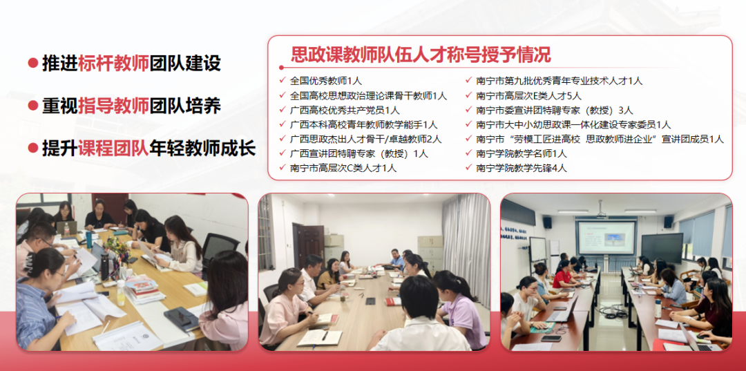 (2)多措并举提升思政教师队伍素质。学校秉承“以顶层设计为引领、以严格遴选为前提、以引育并举为路径,以培训研修为支撑”的工作理念,校地共建,搭建思政课教师队伍集体研修工作机制。采取“线上+线下”“分散+集中”相结合的方式,形成“手拉手”集体备课机制,推动思政课教师队伍“提质升级”。思政课教师队伍中有全国优秀教师、全国高校思想政治理论课骨干教师、广西高校优秀共产党员、广西本科高校青年教师教学能手、广西思政杰出人才骨干/卓越教师、kaiyun体育网页登录入口教师名师等系列人才称号24人次。