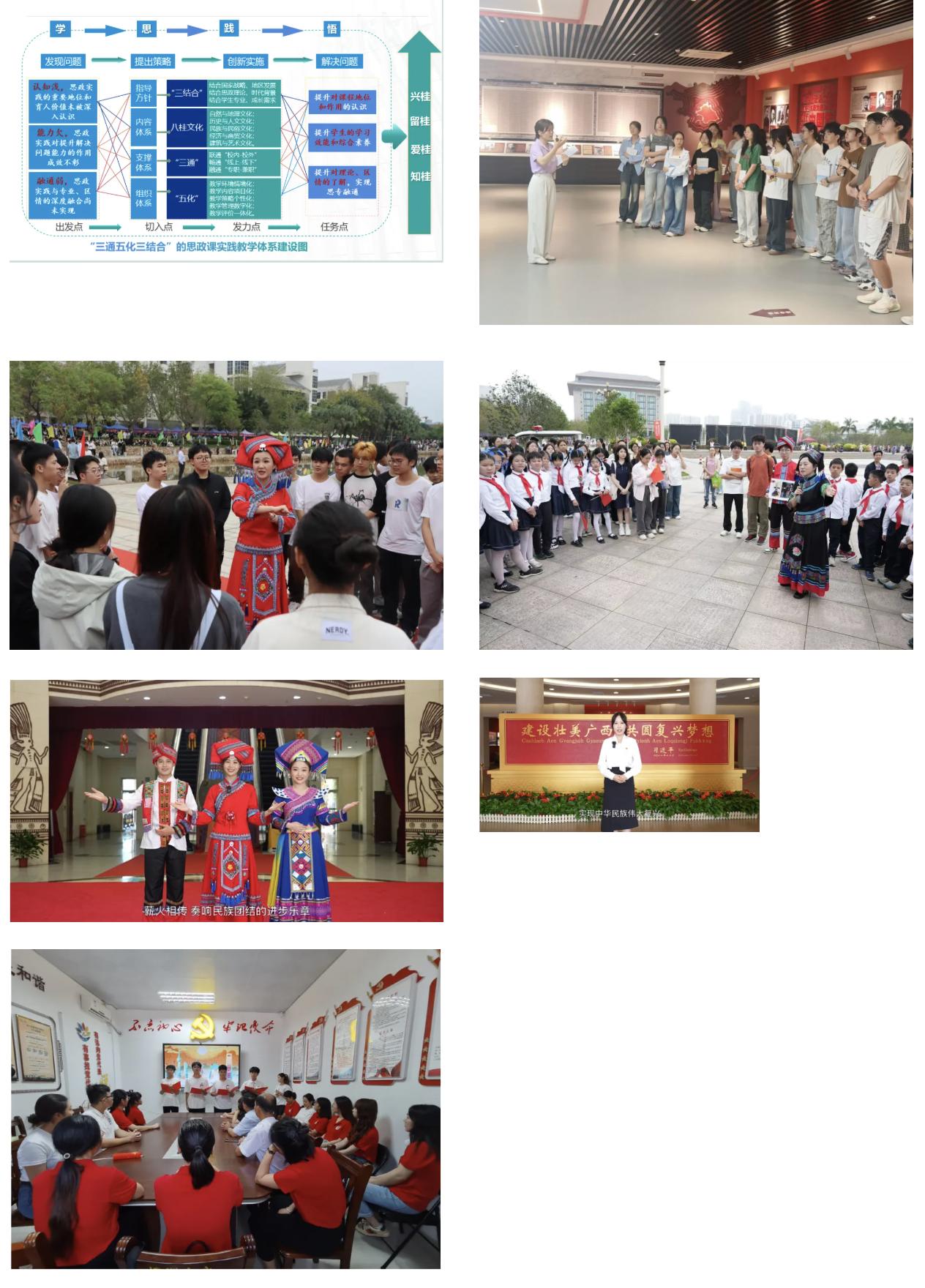 (3)全面优化,高质量提升教育教学水平。探索多元化教学模式,以“学思研践”持续推进混合式教学、情景式教学、“微思政”等多样化教学改革创新。深挖广西地方党史与红色历史文化资源,持续强化思政课程体系和教材体系建设,7门思政课程被立项为校级“金课”。