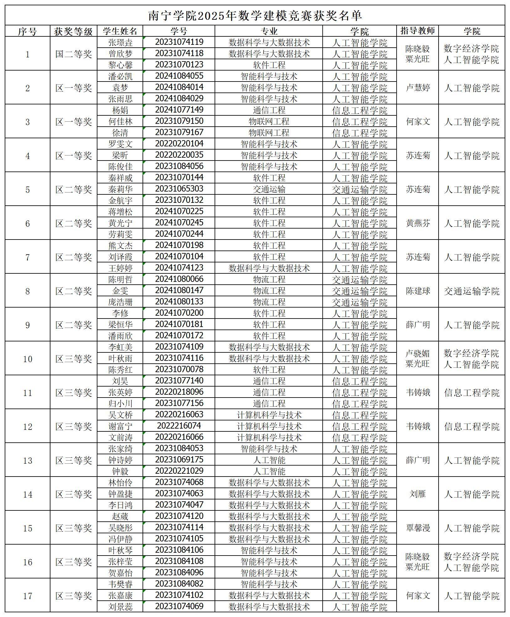 近日,2025 年全国大学生数学建模竞赛国赛及广西赛区结果相继揭晓,kaiyun体育网页登录入口在人工智能学院牵头组织下斩获历史性成绩。其中,国家级二等奖 1 项,广西赛区一等奖 3项、二等奖 5项、三等奖 8项,创下学校升本来国赛和区赛综合最佳战绩;同时首次获评广西赛区 “优秀组织单位”,陈晓毅老师入选 “优秀指导教师”名单。