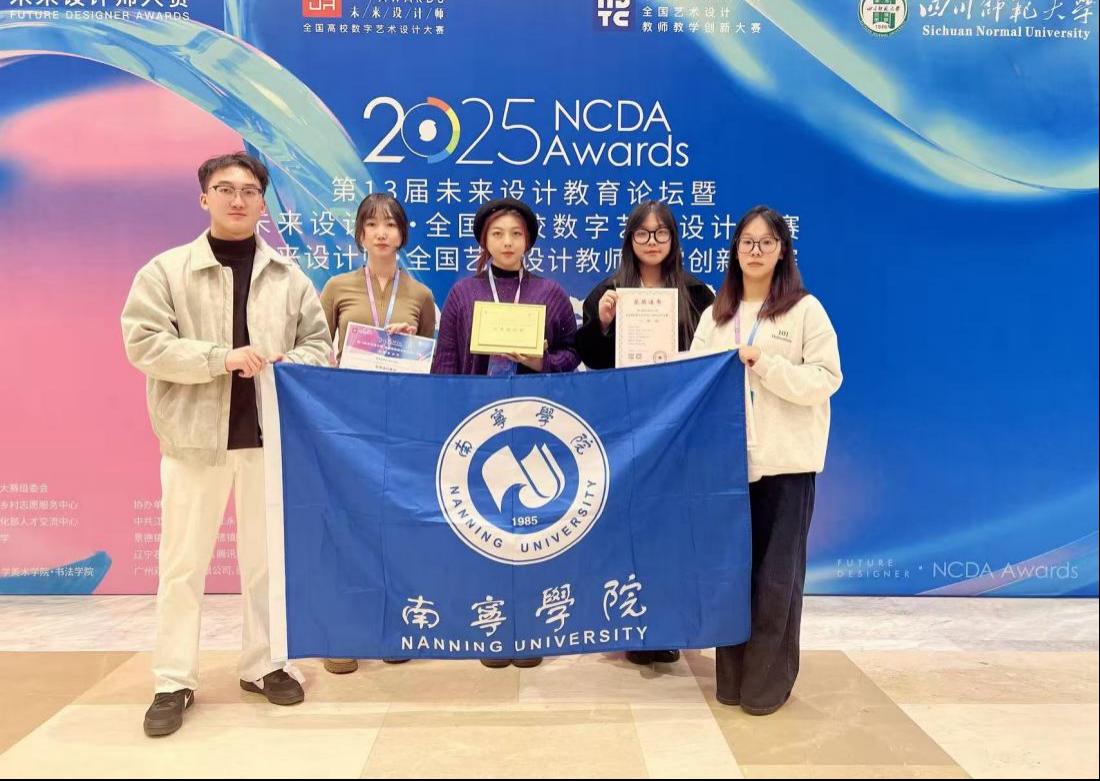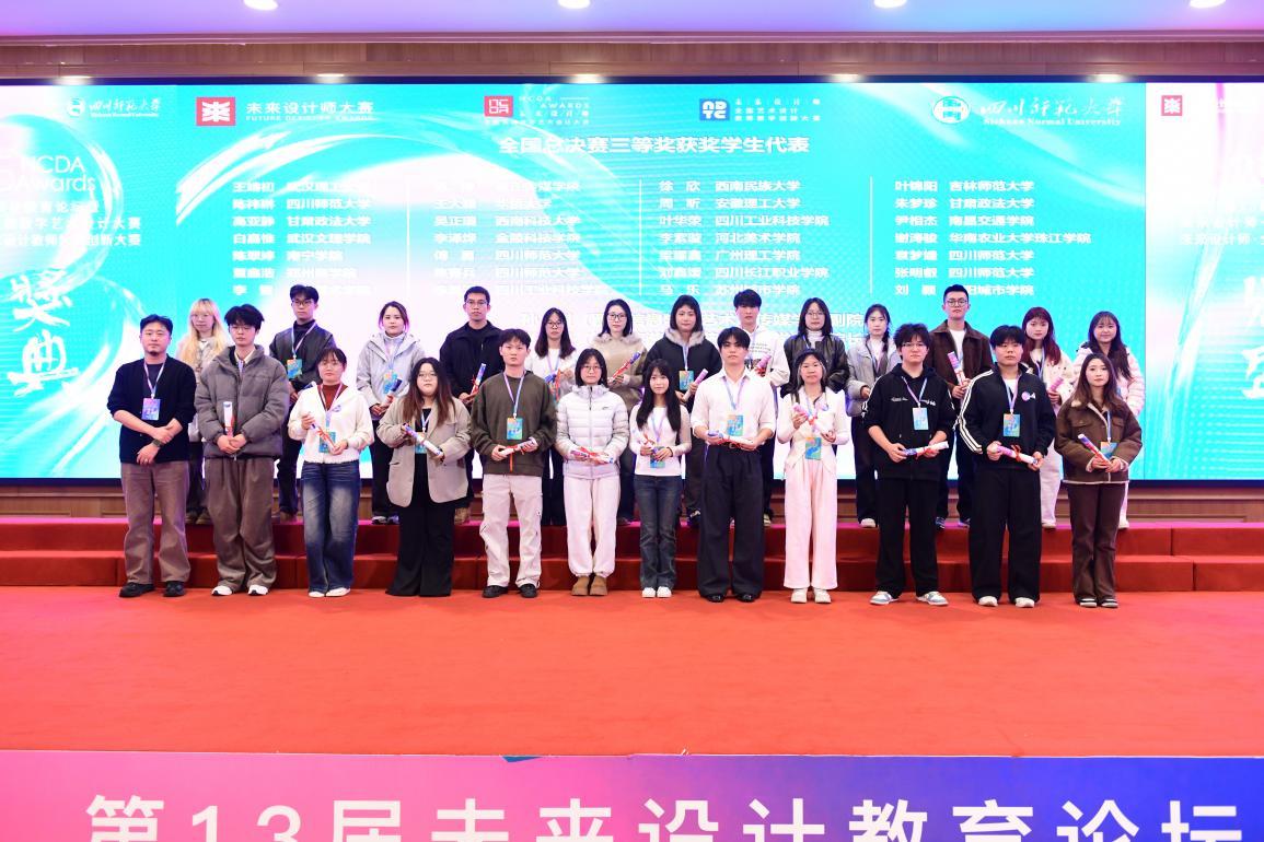 2025年11月23日,在成都举办的第13届未来设计师·全国高校数字艺术设计大赛(NCDA)全国总决赛颁奖典礼暨教育论坛活动圆满收官。未来设计师·全国高校数字艺术设计大赛作为全国性的高水平设计赛事,已成为高校展示设计类专业办学成果、学生展现专业实力的重要平台。艺术与设计学院在此次学科比赛中成绩斐然,由邓琪艺、黄晴川两位指导老师带领获奖学生代表段芸芸、陈翠婷、何正坤三名同学前往成都参加活动,收获了荣誉与宝贵的学习经验。