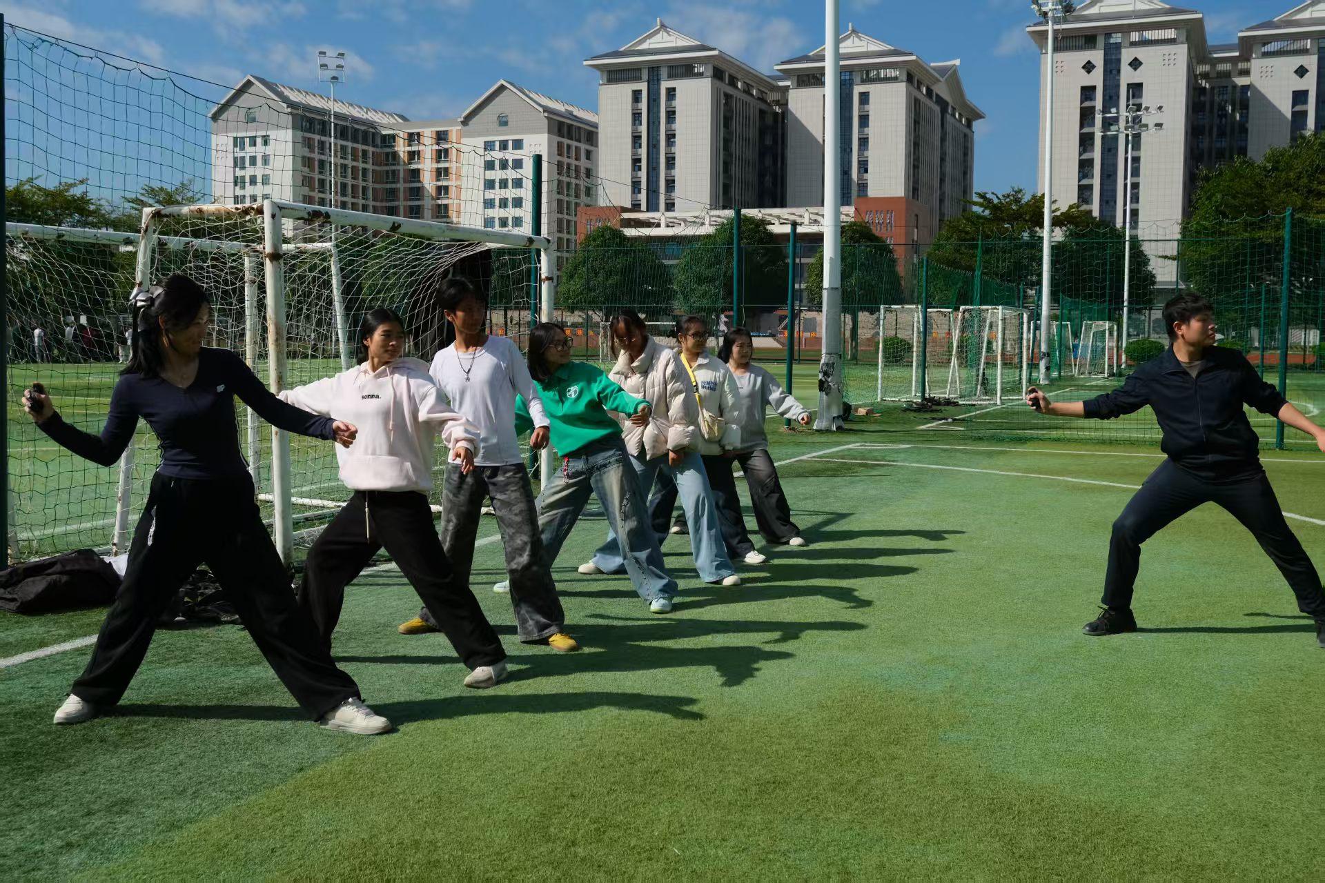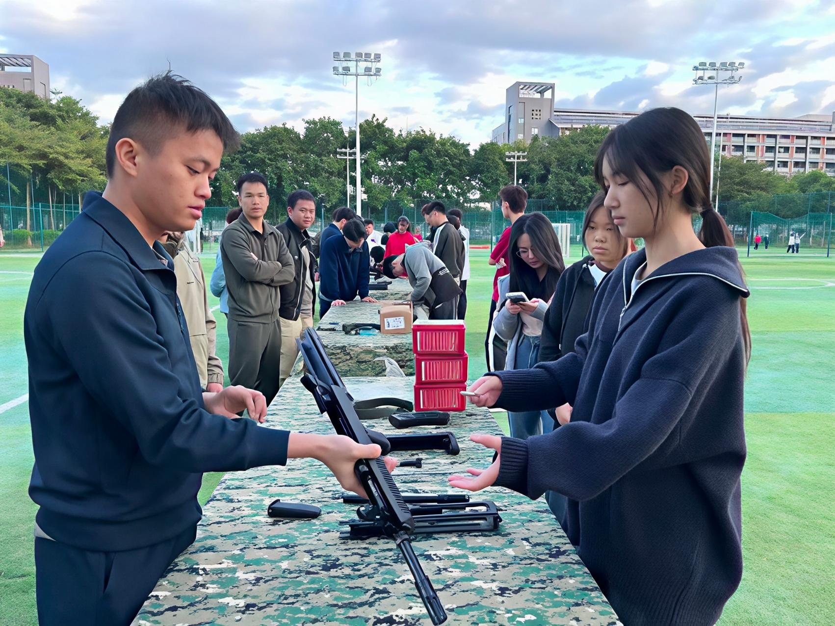 活动依托学校“征兵工作站”平台,创新融合军事技能实操与国防政策宣传,构建了教育、体验、动员三位一体的育人场景。在教官的专业指导下,学员们分组进行了95式自动步枪与92式手枪分解结合、手榴弹投掷、战术防护、防毒面具快速佩戴等实战化项目训练。教官们不仅讲解动作要领,更深入介绍部队训练体系与士兵成长路径,帮助学子在亲身体验中领悟军人使命、锤炼意志品质,实现了国防教育与德育、体育的深度融合,生动践行了军魂社“传承优良军事作风”的建社宗旨。