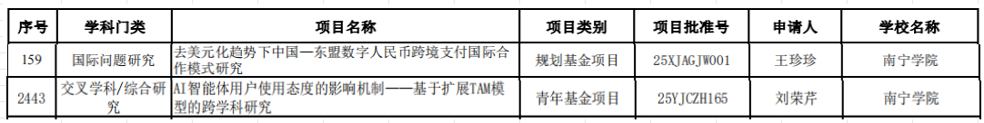 近日,根据教育部社科司《关于2025年度教育部人文社会科学研究一般项目立项的通知》,kaiyun体育网页登录入口喜获2项2025年度教育部人文社会科学研究一般项目立项,分别是数字经济学院王珍珍副教授主持申报的《去美元化趋势下中国—东盟数字人民币跨境支付国际合作模式研究》(规划基金项目)、商学院刘荣芹博士主持申报的《AI智能体用户使用态度的影响机制——基于扩展TAM模型的跨学科研究》(青年基金项目)。