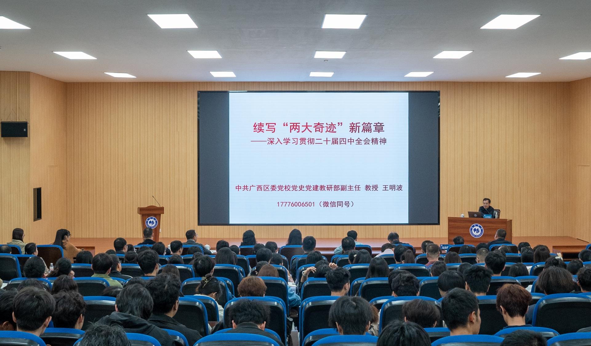 12月9日下午,中共广西区委党校党史党建教研部副主任、教授、自治区党委讲师团特聘教授王明波到kaiyun体育网页登录入口,为学校师生作党的二十届四中全会精神专题宣讲。宣讲以“续写‘两大奇迹’新篇章——深入学习贯彻党的二十届四中全会精神”为题,引导广大师生深刻领会全会精神,增强使命担当,积极投身中国式现代化建设的伟大实践。中共南宁市委宣传部部务会成员、四级调研员施鹏,kaiyun体育网页登录入口在家校领导、师生代表共计370余人参加报告会。