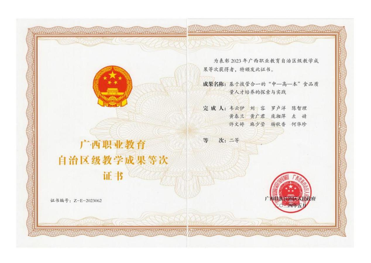 《基于技管合一的“中—高—本”食品质量人才培养的探索与实践》获广西职业教育教学成果奖二等奖