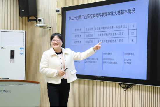 梁婷婷老师针对第二十四届全区高校教育教学数字化大赛的赛事特点,分享了融合AI技术的数字化课程参赛经验。她结合参赛赛道要求,讲解了数字化课程建设中“双线交织、三阶递进、深度学习”的设计思路,阐述了AI技术在课前导学、课中教学、课后评价全环节的赋能路径,并结合自身参赛经历给出实操建议:参赛材料要紧扣政策导向、做实数据支撑,视频展示要注重真人出镜、动态呈现课程特色,答辩环节要提前准备、逻辑清晰,同时指出数字化、智慧化是未来课程建设的重要趋势,为教师们把握赛事方向、探索教学创新提供了新思路。