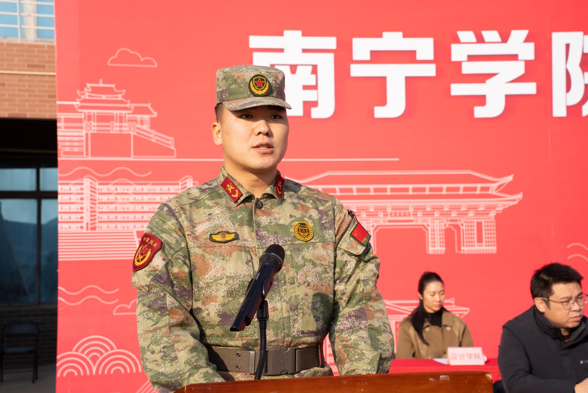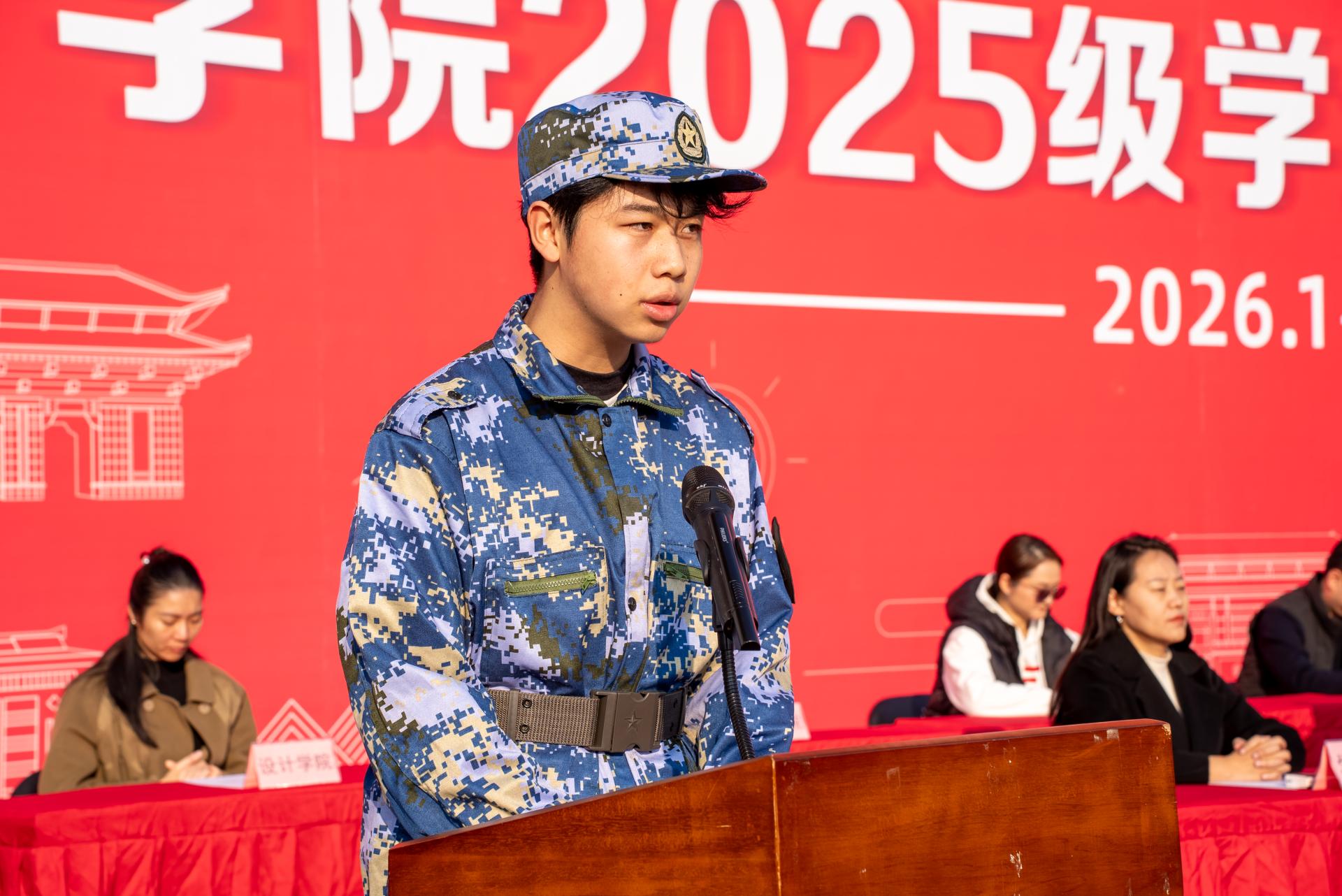 艺术与设计学院2025级新媒体艺术3班杨东霖同学作为新生代表发言。他表示,恰逢南院"四秩芳华",2025级学子既是历史的见证者,更是新篇的开创者。他回顾了入学以来在南院的成长与收获,深刻认识到军事训练是体能与精神的双重淬炼。作为艺术专业学生,他领悟到创意根植于秩序,个性离不开集体支撑,代表全体新生郑重承诺:将服从命令、听从指挥,尊重教官、虚心学习,磨砺意志、团结互助,以饱满热情迎接挑战,展现南院学子的蓬勃风采。