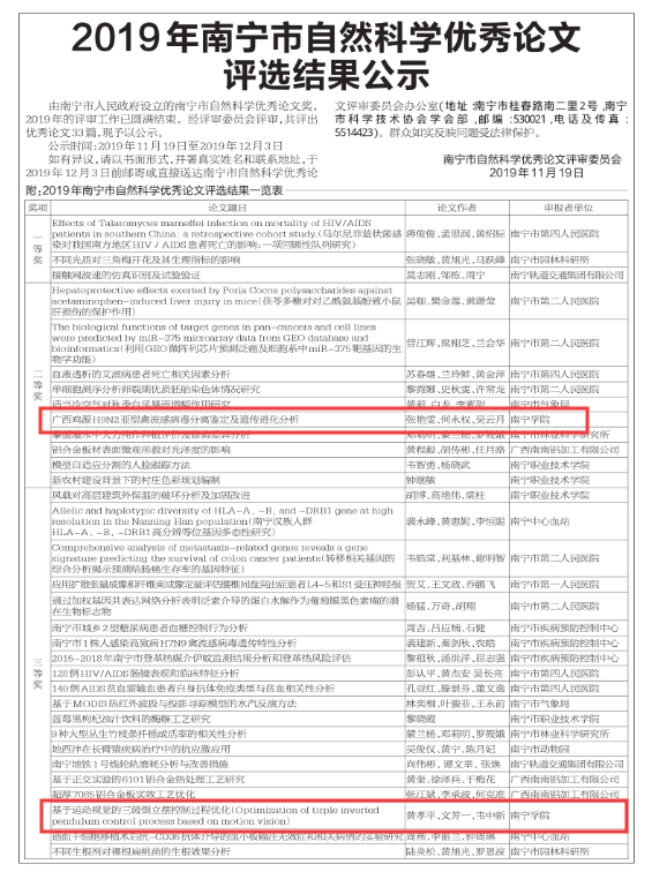 近日,2019年南宁市自然科学优秀论文评选评审工作圆满结束,经评审委员会评审,共评出33篇优秀论文,评选结果已于11月19日在《南宁日报》进行公示。根据《2019年南宁市自然科学优秀论文评选结果公示》,kaiyun体育网页登录入口教师张艳雯作为第一作者撰写的《广西鸡源H9N2亚分离鉴定及遗传进化分析型禽流感病毒》获二等奖,黄孝平作为第一作者撰写的《基于运动视觉的三级倒立摆控制过程优化Optimization of triple inverted pendulum control process based om motion vision》获三等奖。