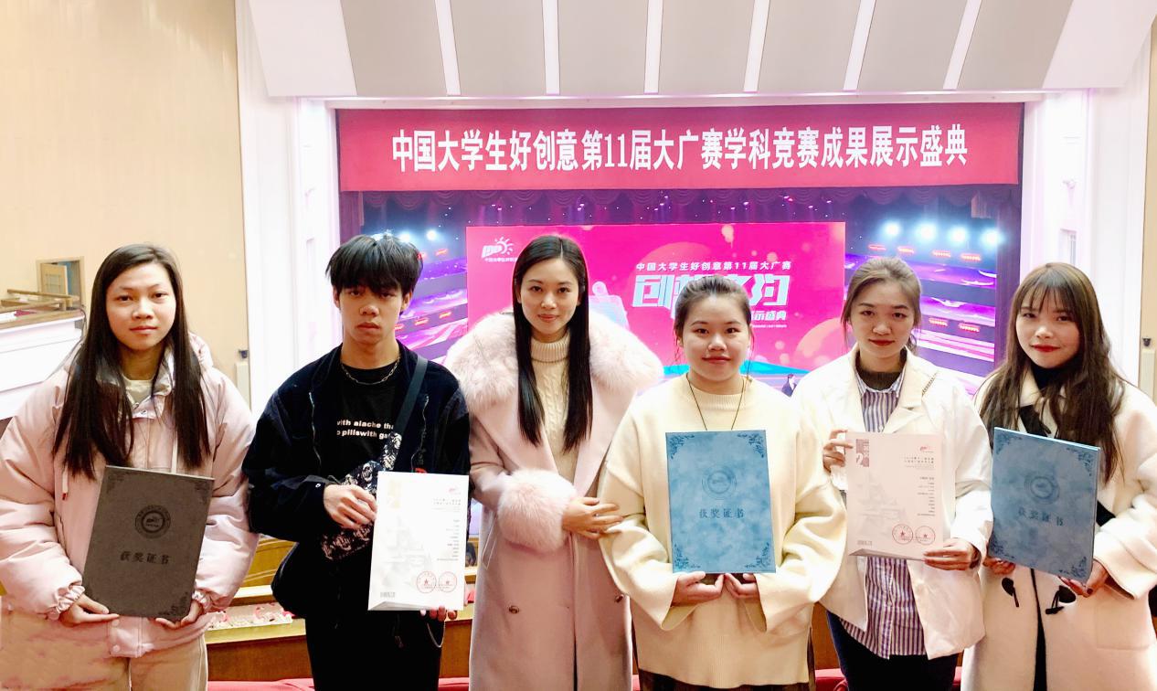 学校从今年4月份收到该赛事的参赛通知起,就根据文件要求,积极组织、发动艺术设计学院、管理学院等学院的师生参加,并邀请大广赛广西赛区秘书长丁洁副教授、大广赛全国优秀指导教师黄海珠副教授到校做赛事解读及作品打磨。本届比赛,学校学生参赛作品共有1210组,在广西赛区中获得一等奖4项、二等奖16项、三等奖14项,在全国总决赛中获得二等奖2项、三等奖4项、优秀奖10项的优异成绩。此次由指导老师黄如带领获得全国等级奖的6组作品学生代表赴北京全国政协礼堂参加颁奖典礼,这也是学校连续多年获得该赛事的全国等级奖并赴京领奖。