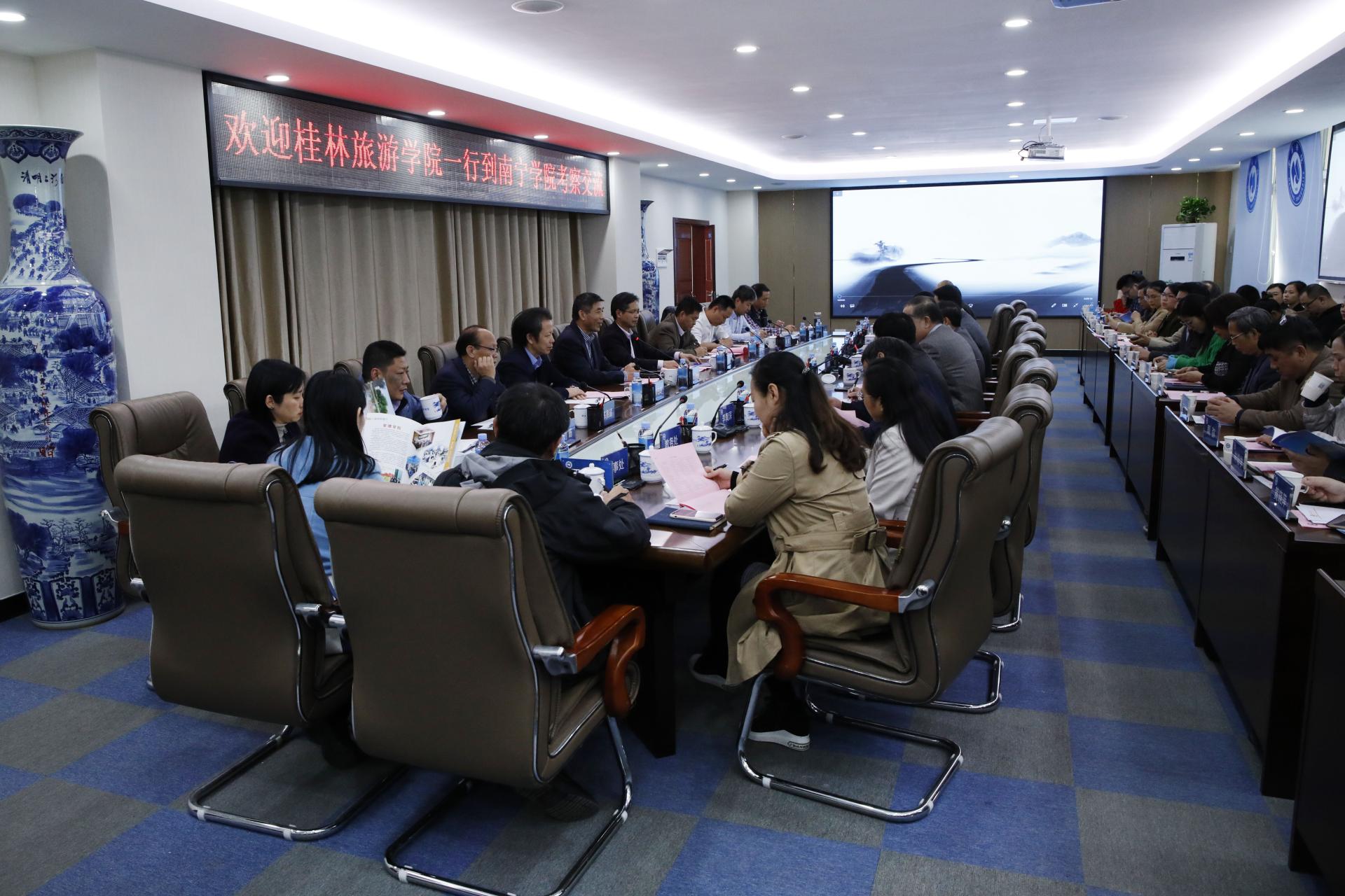 2019年126日下午,桂林旅游学院党委副书记、校长程道品,党委副书记林业江,副校长林伯明、王文、陈贵超等一行30多人到学校考察交流校长赖每,党委书记刘彪,副校长陈雄章李陶深等校领导参加交流活动