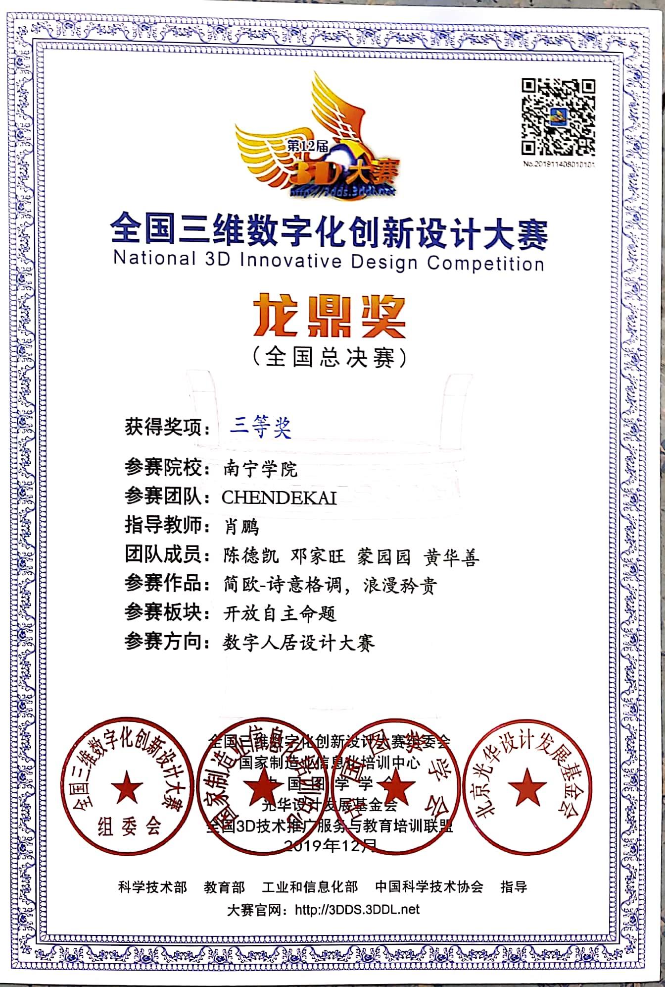 2019年12月6日-9日,第12届全国三维数字创新设计大赛(大学生组)年度总决赛在云南玉溪隆重举行,艺术设计学院师生参加比赛喜获国赛三等奖的佳绩.