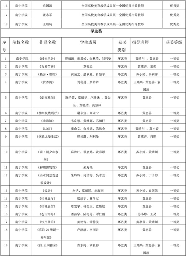 艺术设计学院环境设计专业学生参赛团队在指导教师们(王灵、秦莉萍、袁国凯、蓝志军、玉荣、王瑾琦、黄惠善、丁子容、黄晴川、苏小婷)的精心指导下,积极备赛,经过多翻打磨,高质量地完成了参赛作品。师生参赛作品,通过激烈角逐,最终学生获奖作品一等奖21项,二等奖13项,三等奖4项;教师获奖作品一等奖3项,二等奖2项;优秀指导教师奖10人;kaiyun体育网页登录入口荣获先进单位1项,kaiyun体育网页登录入口荣获教学优异成果奖1项的优异成绩。