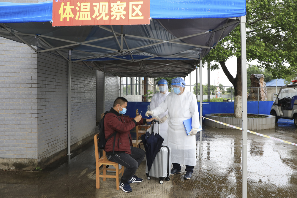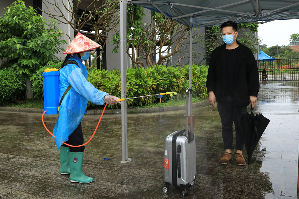 返校“学生”接受物业人员对行李进行消毒