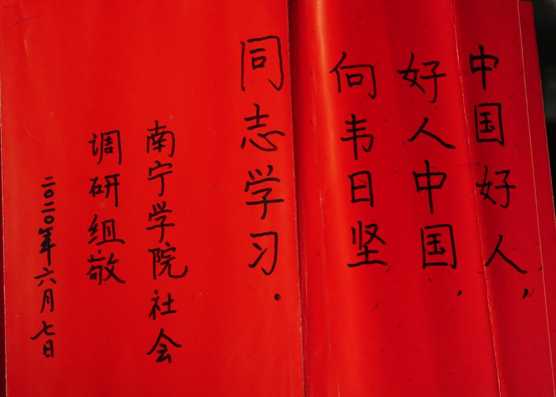 6月3日,调研组来到学校附近的蒲庙镇仁福村,调研北觥古民居。北觥古民居属于南宁市文物保护单位,是抗法英雄苏元春得力助手颜崇魁的故居。故居是颜崇魁回乡后按照当地壮族建筑形式所修建,具有较高的壮族民族考古价值。颜氏古民居共6座18间,面积约800平方米,为砖木青瓦结构,除大宅门已被拆除之外,其余大部分保存完整。古民居分卧房、餐厅、客厅等,其建筑形式与今天仍在当地壮族群中沿用的壮族民居形式基本相同。每间房的门、窗、神楼、屋檐等均雕刻花鸟虫鱼和龙凤呈祥等图案,部分墙壁还有多彩壁画,具有极高的艺术欣赏价值。