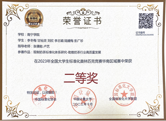 在学科竞赛中,学生运用气相色谱法,对现制奶茶中的反式脂肪酸等潜在有害成分进行了精确分析,并基于这些数据和研究,以“现制奶茶标准体系研究—助推奶茶行业高质量发展”为主题参加了2023全国大学生标准化奥林匹克竞赛并获华南赛区二等奖。这一实践成果不仅彰显了学生在食品安全与标准化研究领域的潜力,也反映了其严谨的科研方法和实践能力。