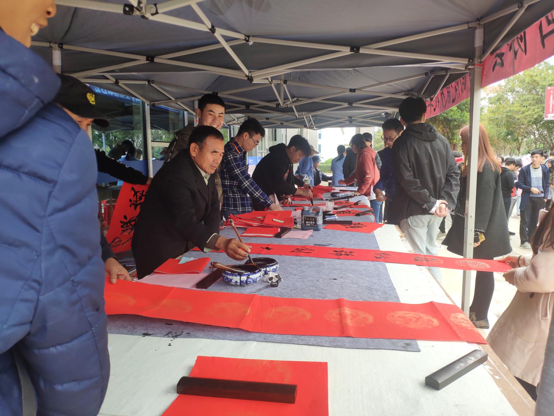 19号上午,学校学生活动中心大厅门口人头攒动、气氛热烈。活动现场,由校书画协会的学生和指导老师一起泼墨挥毫写春联,为南院学子送上新春祝福。喜庆的红纸为底,黑墨为字,一幅幅充满吉祥、祝福的春联在他们的手中随笔而出,一个个形态各异的“福”字在寒冷的冬日彰显出暖洋洋的喜气。整个现场都洋溢着新年喜庆气氛。