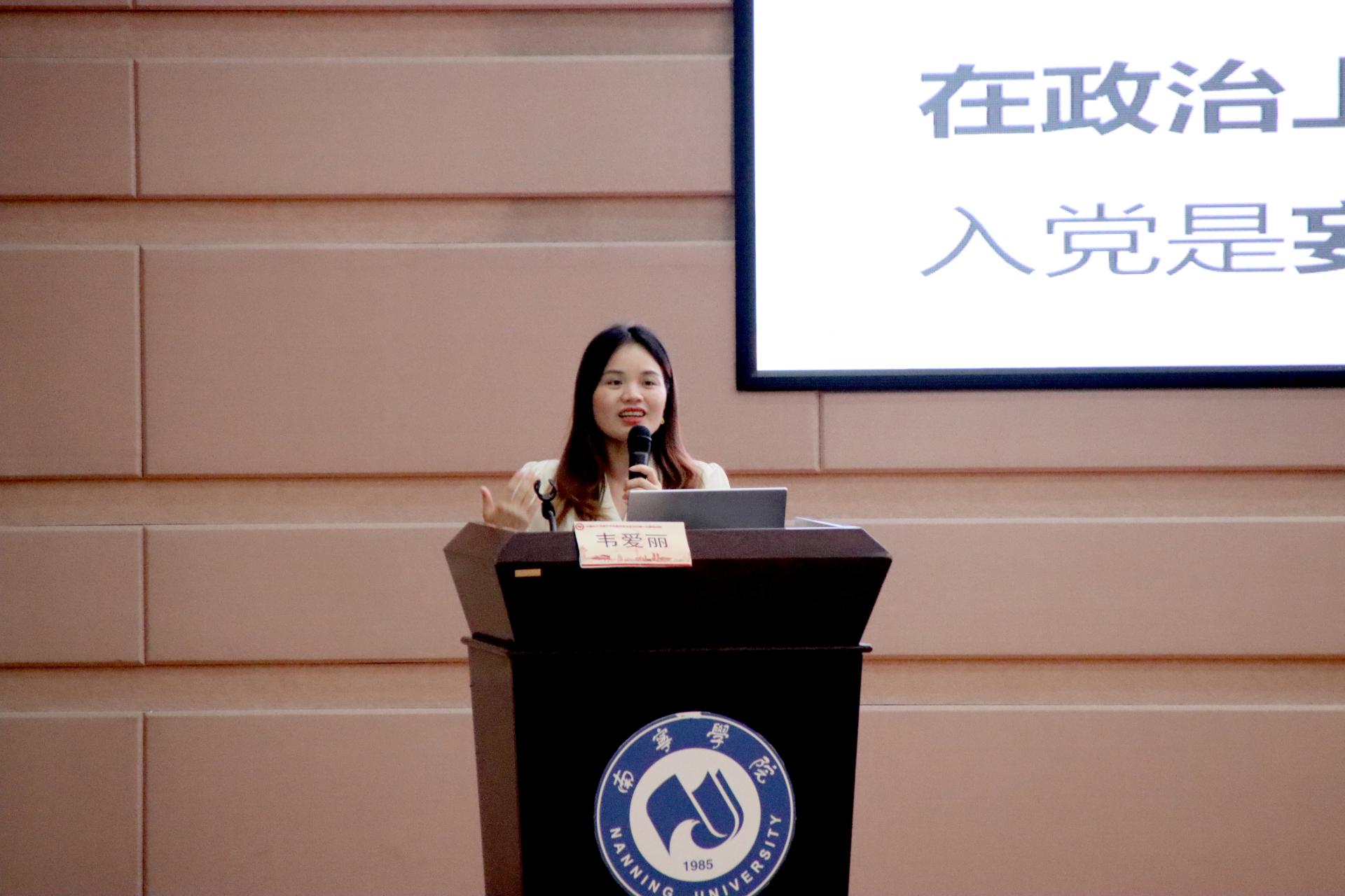 4月21日,培训班第五课由韦爱丽老师为学员讲授“端正入党动机 筑牢信仰根基”。韦爱丽老师提出端正入党动机需要做到的“三增强”:一、增强对马克思主义、共产主义的信仰;二、增强对中国特色社会主义的信念;三、增强对实现中华民族的伟大复兴的信心。