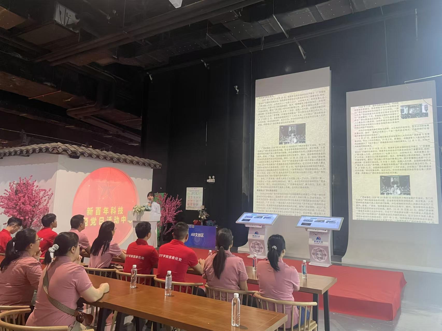 “传承红色基因”环节,解说员引领党员们参观了位于AI智慧党建展示馆的“在烽火中建党”主题展。通过“党建文化VR体验” “党史问答PK赛”“红色光影图书”“红色文化全息互动展示”等数字科技互动体验项目,党员们身临其境地体验了中国共产党发展历程,深刻感受到了红色革命文化的深厚底蕴,了解了先进数字科技在红色文化传承中的重要作用。