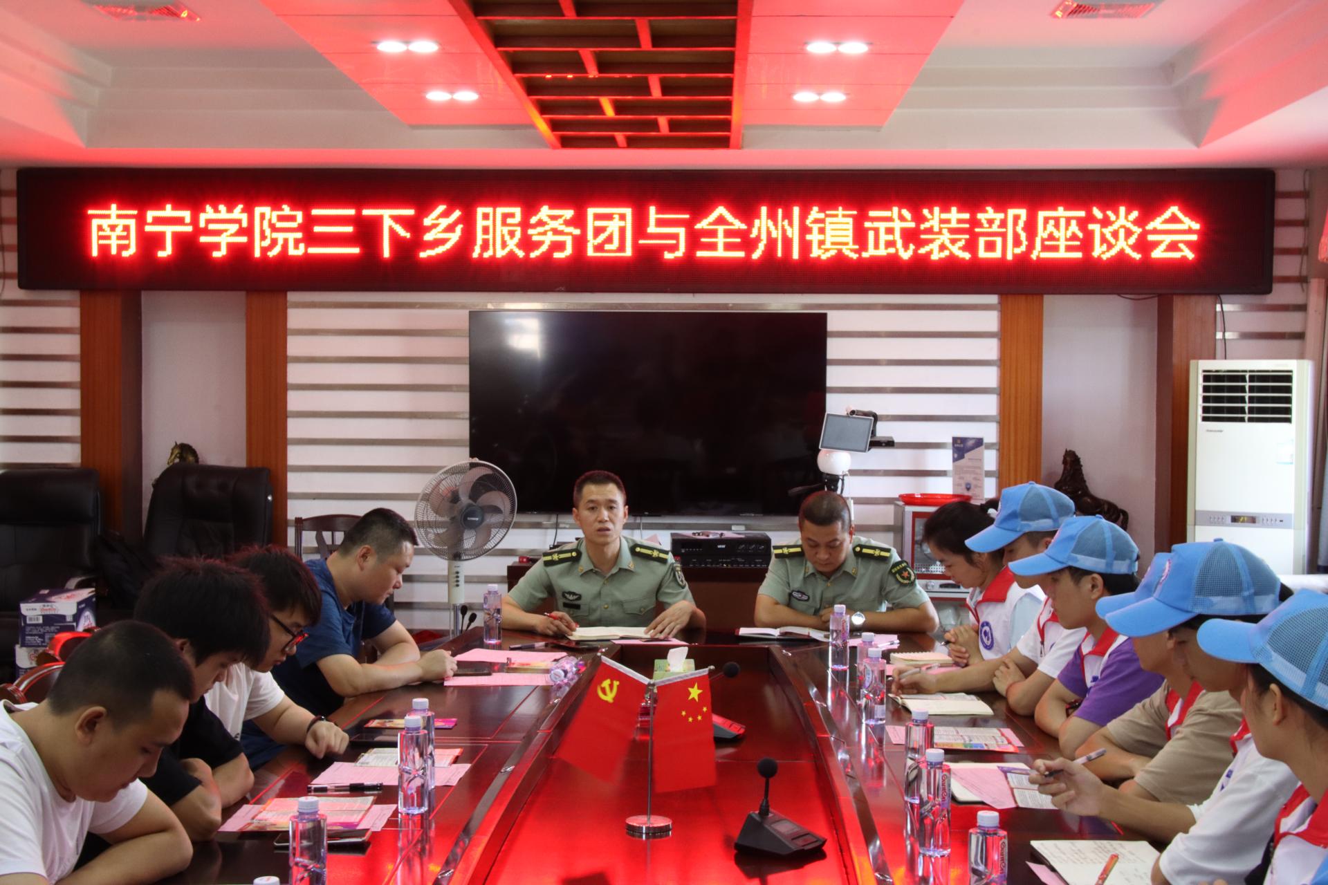 强军在召唤,报国正当时。服务团师生与全州镇武装部相关领导、退役军人、意向入伍的大学毕业生进行座谈交流,了解全州镇2023年征兵工作、退役军人服务、成长发展等情况,并就如何开展全州镇2023年秋季征兵进行详细交流。服务团中的退役军人房文志、粟杰灿、梁瀚文三位同学分别从军旅生活、参军前后个人变化、参军感想等方面进行分享。