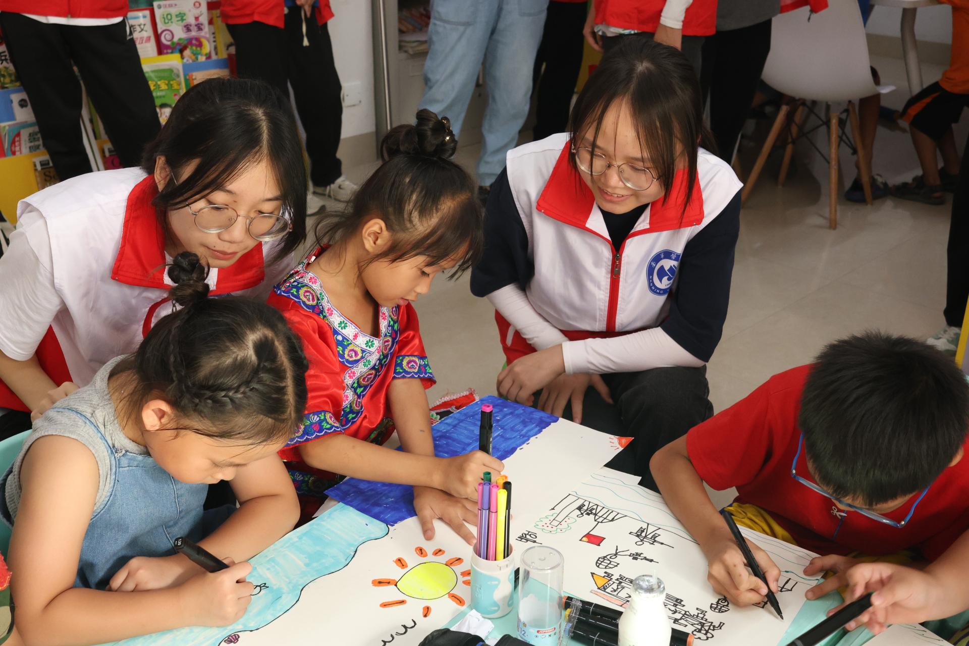 促进团师生还与孩子们一起绘画折纸。孩子们在师生的指导下,发挥自己的想象力在画纸上尽情描绘出一幅幅精美的画作,一张张彩纸在孩子们的手中变成了缤纷多彩的爱心、千纸鹤等作品,寄托着孩子们对父母的祝福与思念,亦抒发了他们对美好生活的向往。