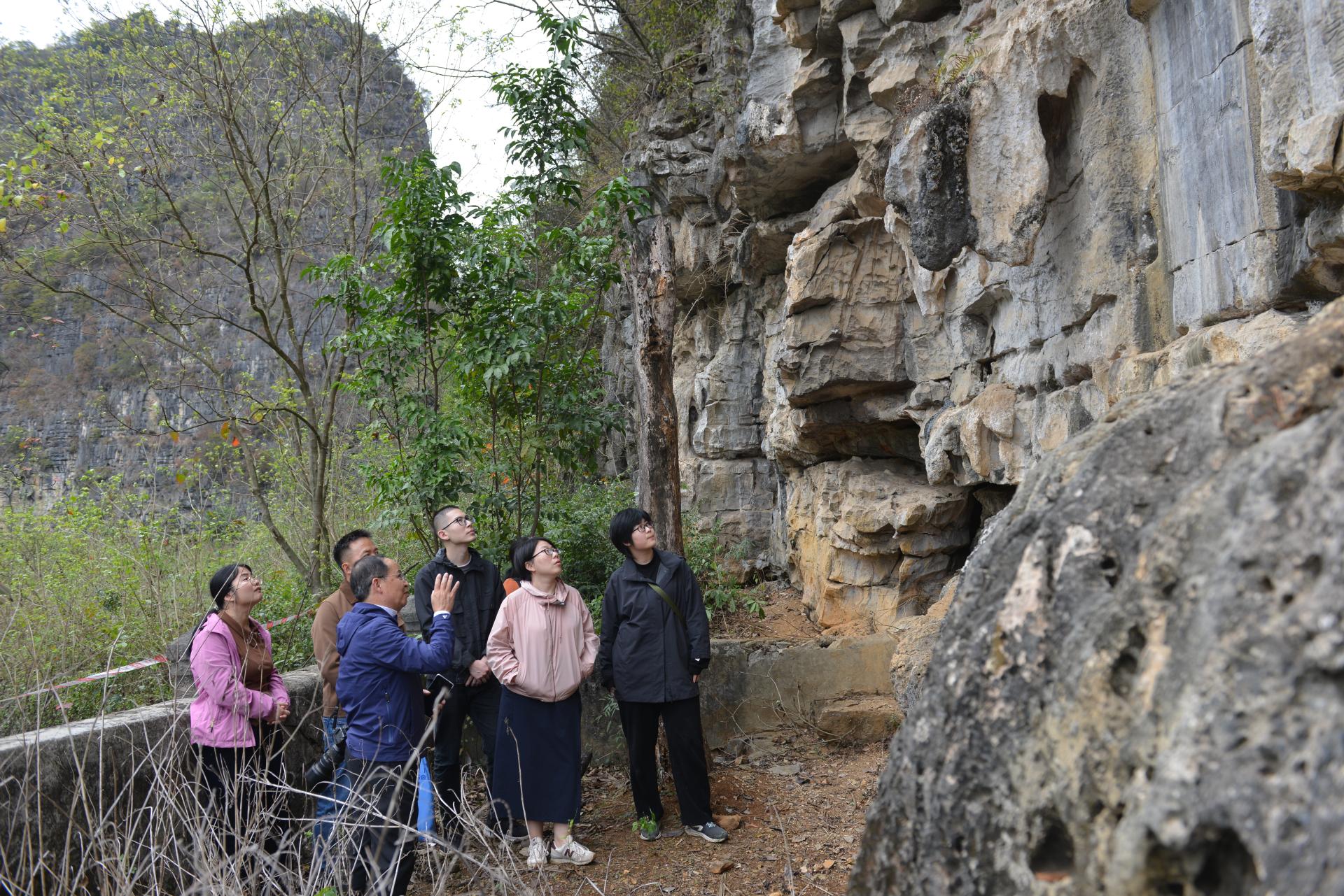 课程团队首站抵达来宾麒麟山人遗址。作为红水河流域重要的古人类文化遗址,盖头洞内出土的三万年前古人类头骨化石,为研究壮族文明起源提供了关键物证。陈雄章教授在现场讲解时指出:“这里不仅是壮族先民的栖息地,更成为当代三月三节庆中壮族始祖祭祀的文化坐标。” 团队成员俯身观察岩层纹理,触摸洞壁斑驳的历史印记,感受万年文明的厚重底蕴。