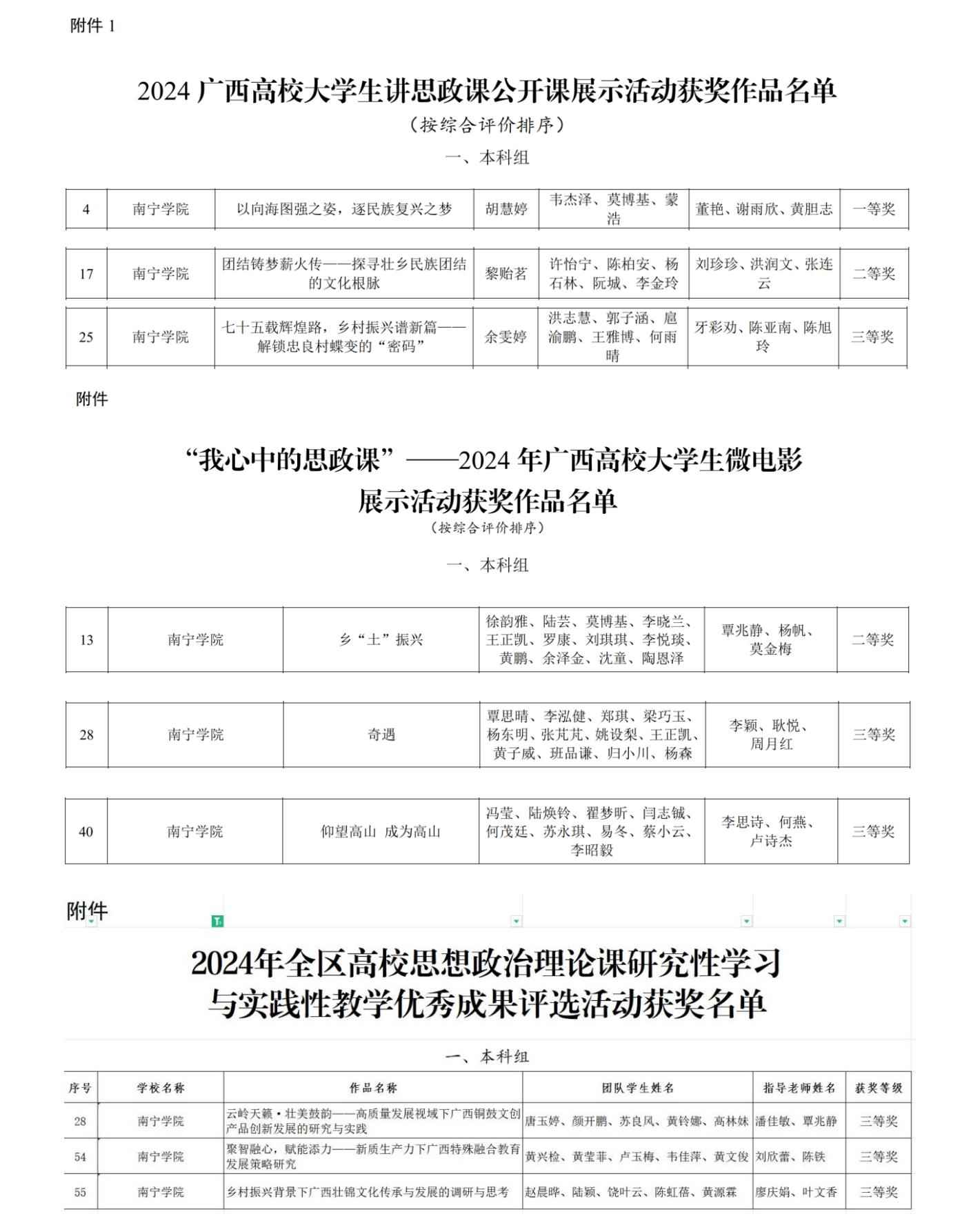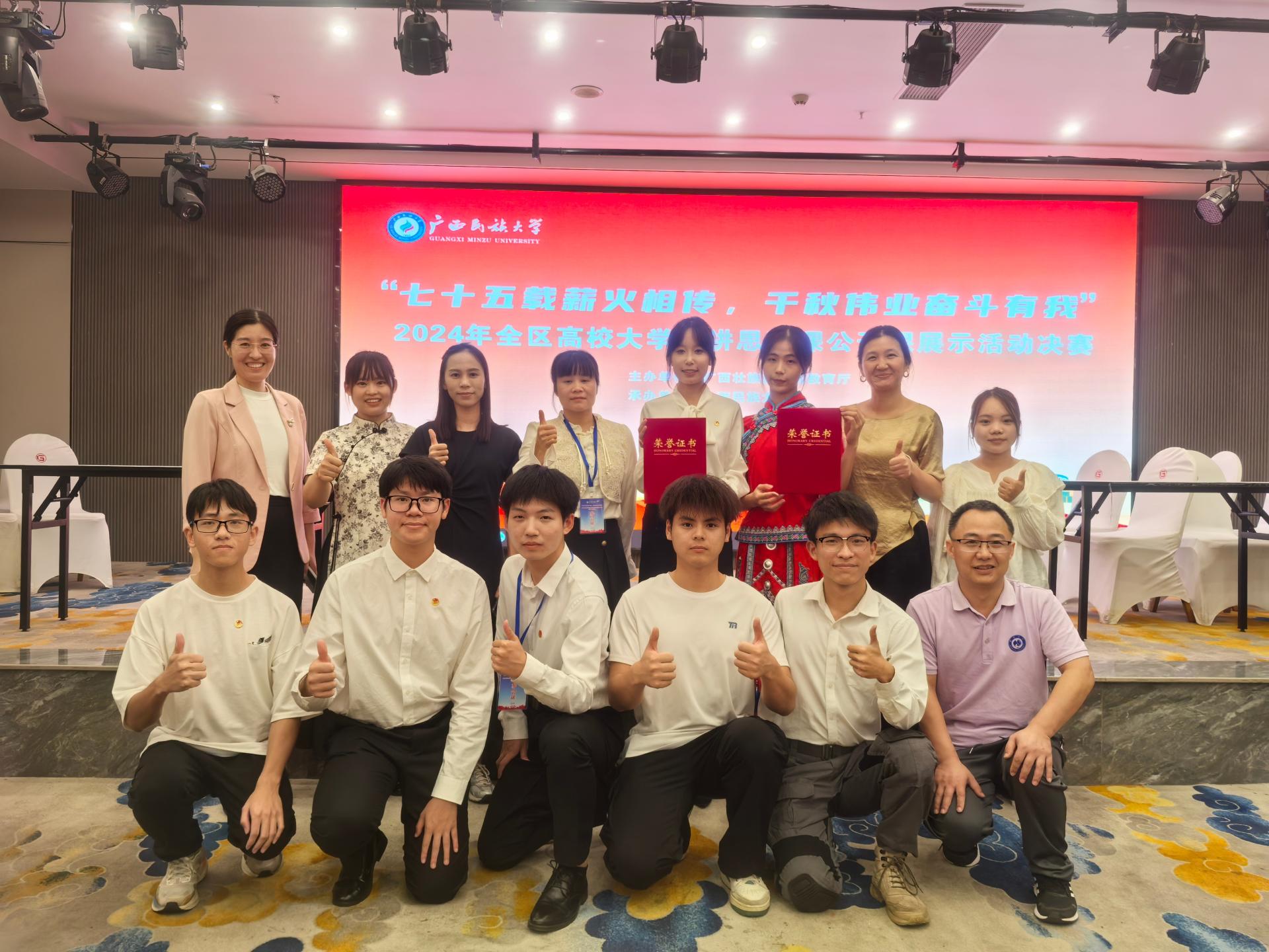 其中,全区高校大学生讲思政课公开课展示活动中,作品“以向海图强之姿,逐民族复兴之梦”获一等奖,作品“团结铸梦薪火传——探寻壮乡民族团结的文化根脉”获二等奖,作品“七十五载辉煌路,乡村振兴谱新篇——解锁忠良村蝶变的‘密码’”获三等奖;全区高校大学生微电影展示活动中,作品“乡‘土’振兴”获二等奖,作品“奇遇”“仰望高山、成为高山”获三等奖;全区高校思想政治理论课研究性学习与实践性教学优秀成果评选活动中,作品“云岭天籁·壮美鼓韵——高质量发展视域下广西铜鼓文创产品创新发展的研究与实践”“聚智融心,赋能添力——新质生产力下广西特殊融合教育发展策略研究”“乡村振兴背景下广西壮锦文化传承与发展的调研与思考”获三等奖。以上获奖系列作品紧扣时代主题,围绕红色足迹寻访、助力乡村振兴、环保科普教育、优秀传统文化传承、区情社情调研等内容开展实践活动。在行走的大思政课堂中,同学们识国情、强使命、作贡献、长才干,点燃了青春激情。