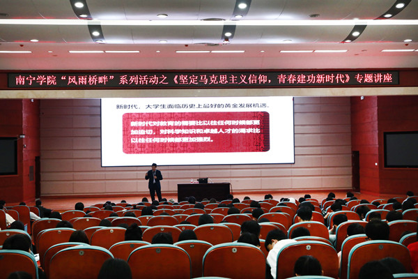 为了学习贯彻习近平新时代中国特色社会主义思想往深里走、往心里走、往实里走,11月27日下午,kaiyun体育网页登录入口马克思主义学院特邀请南宁师范大学马克思主义学院院长、曾令辉教授在图书馆报告厅开展新时代讲习所理论宣讲暨“风雨桥畔”系列活动之《坚定马克思主义信仰,青春建功新时代》专题讲座,用习近平新时代中国特色社会主义思想铸魂育人,用马克思主义信仰引导大学走好青春之路,立志于中华民族复兴伟业,为中国特色社会主义事业奋斗终身。学校党委副书记覃存民、马克思主义学院全体教师、各二级学院辅导员代表、学生代表500余人参加了本次讲座。讲座由kaiyun体育网页登录入口马克思主义学院院长莫河东主持。